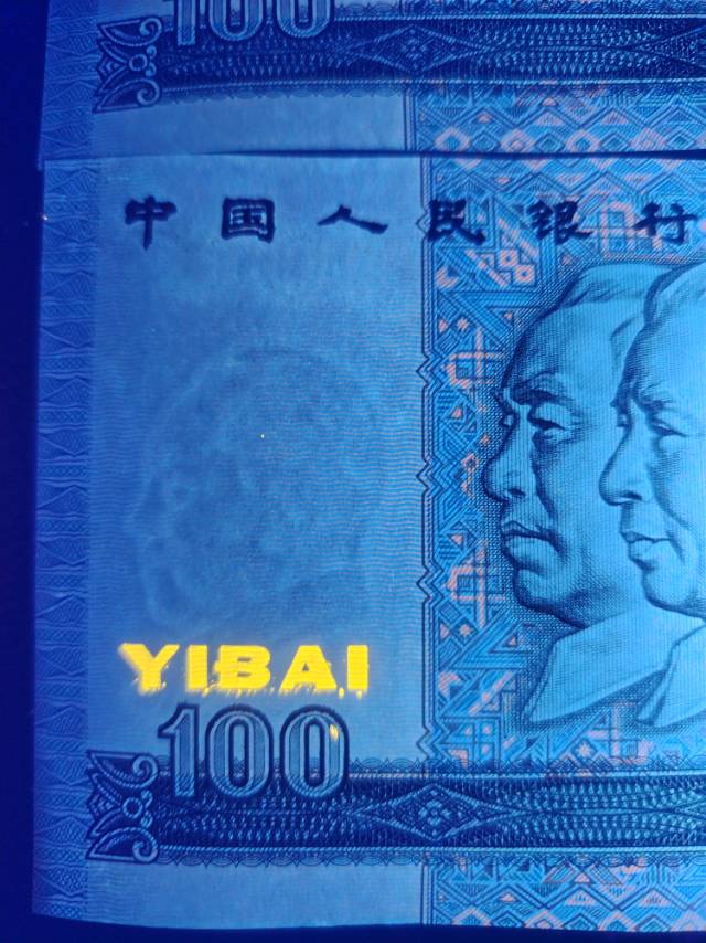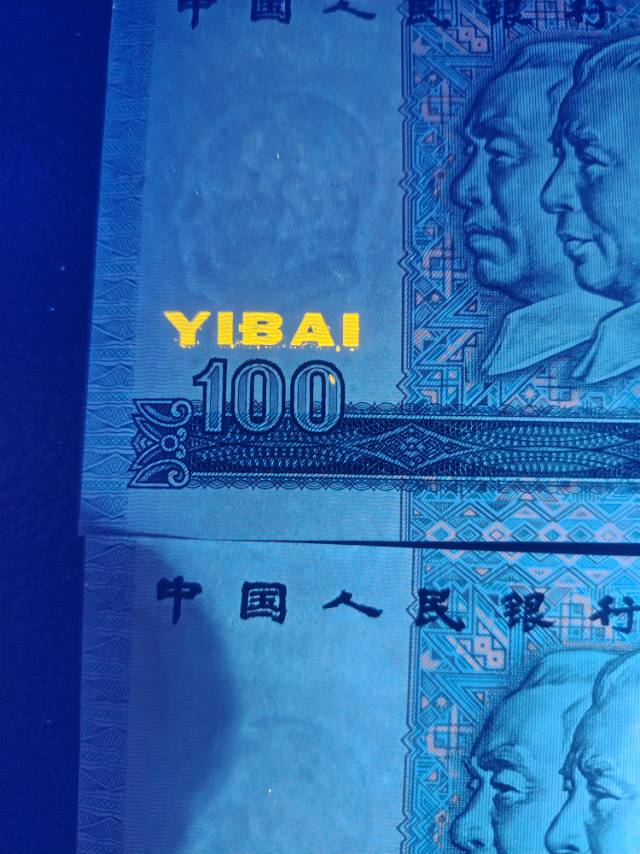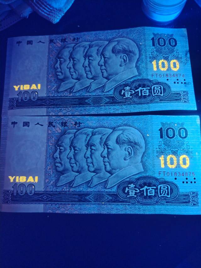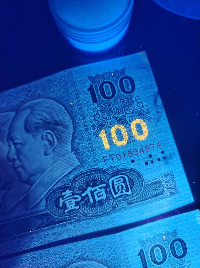 出2张90年100元趣味荧光币………………~~~~~