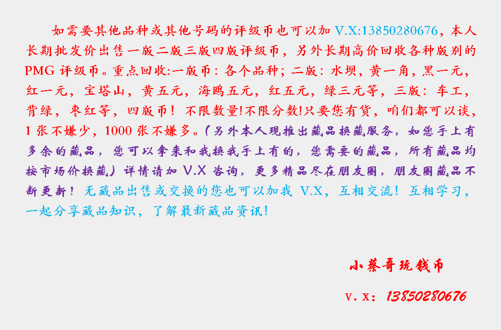 备注:本店主营PMG评级纸币,另外长期高价回收各种版别的PMG评级币。重点回收二版币:黑一元,红一元,宝塔山,黄五元,海鸥五元,红五元,绿三元,大黑拾等,三版:五星车工,古币车工,背绿,枣红,背水等,四版币,不限数量!不限分数!只要您有货,咱们都可以谈,1张不嫌少,1000张不嫌多。