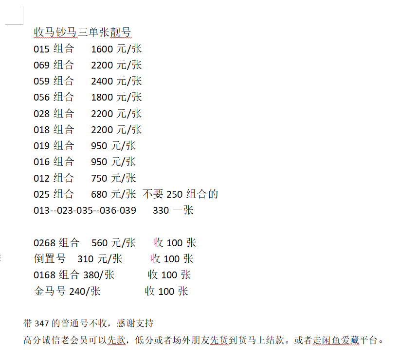 收马钞马三 倒置号 全偶 金马号