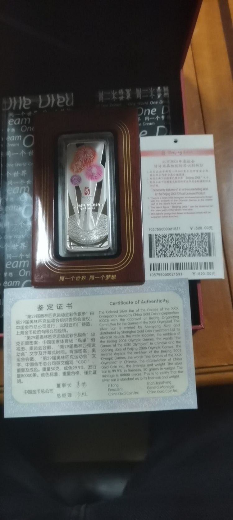 品相非常非常好,50克彩音条,第二十九届奥林匹克运动会彩色银条。