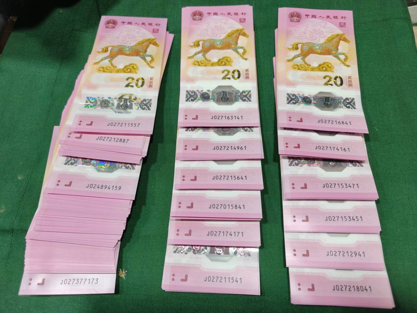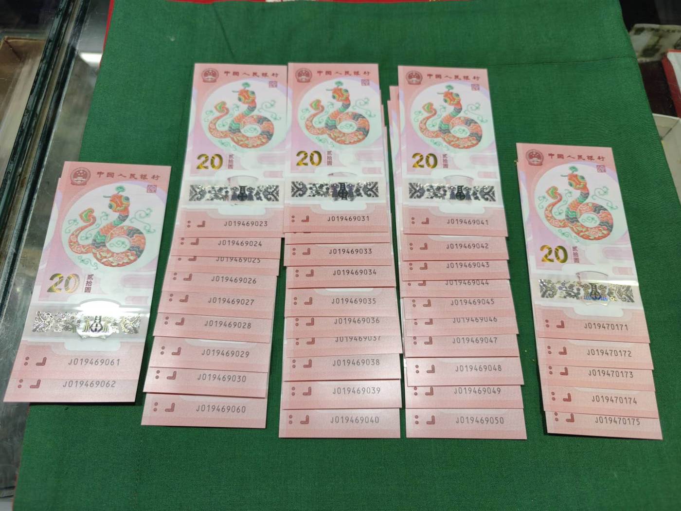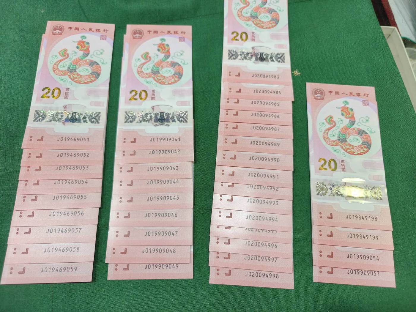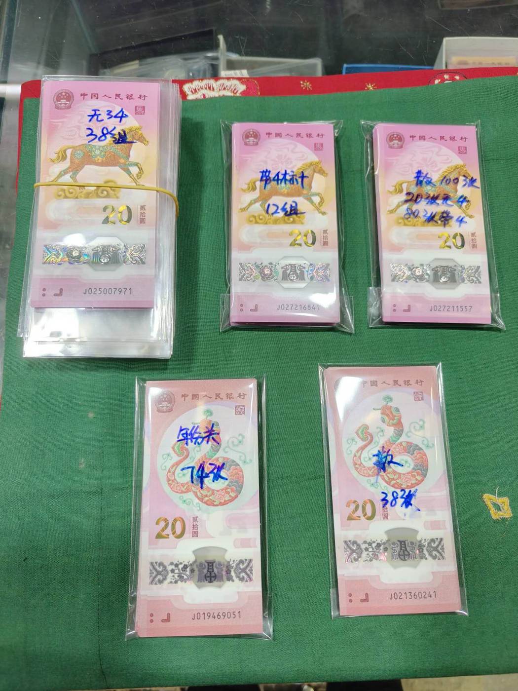 第1项:马钞38组无34标十……350/组、第2项:12组带4标十……330/组、第3项:100张散钞(20张无4、80张带4)……32/张、第4项:蛇钞74张年份头……25/张、第5项:38张带4蛇钞……23/张 可以单项出 包顺丰