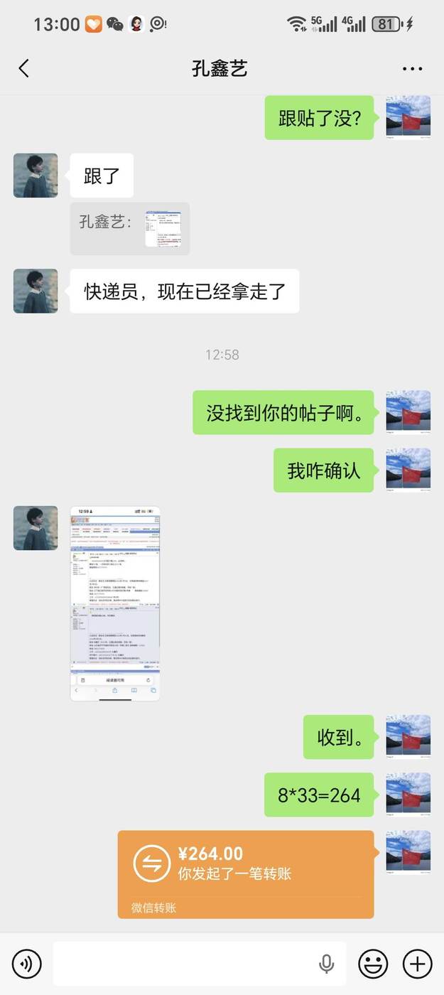 确认8张,已付货款264元
