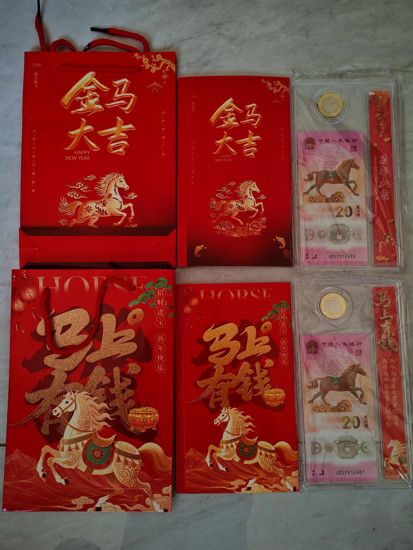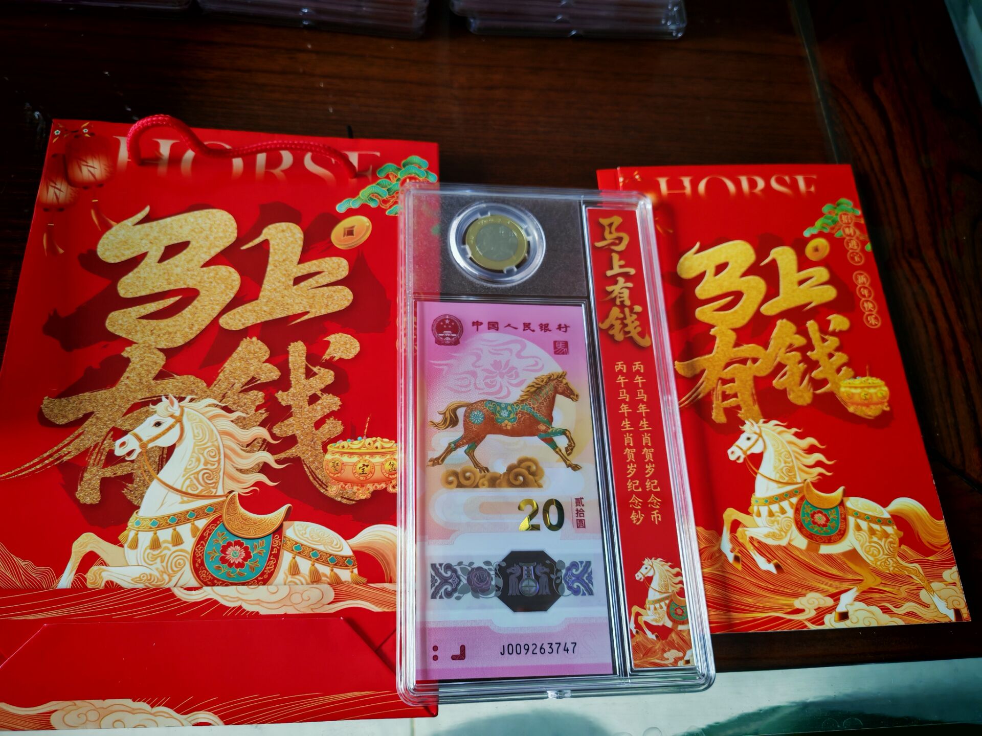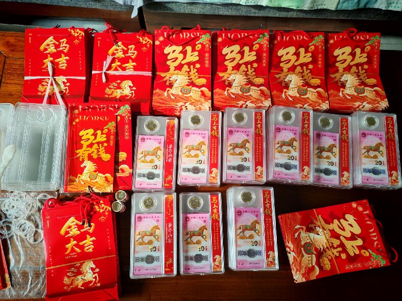 批发零售马上有钱、金马大吉、保真、品相如图、一币一钞带手提袋、批发价58元一套、零售88元一套包邮、实物比图片好很多、微信13833229040联系。