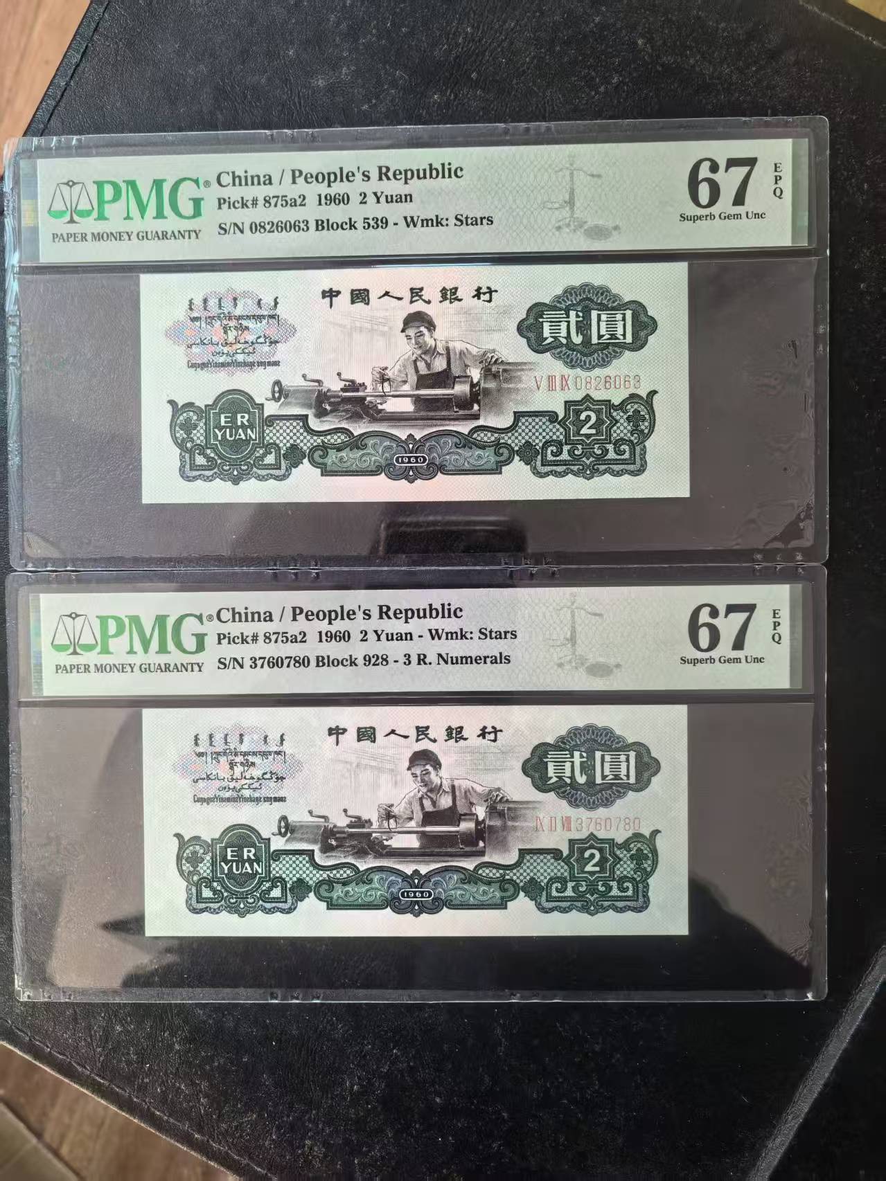 三版五星车工美评PMG67E无47+67E无4,全新直版,颜色鲜艳,水印清晰,两张售价4260包顺丰