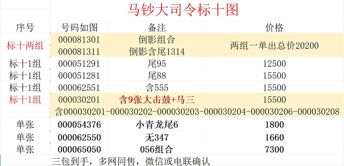 售《马钞大司令标十》————号码如图