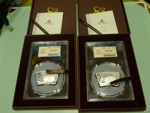出售金币总公司封装19年扇形银猪2枚;世界杯银币一枚;16届亚洲运动会银币1枚。