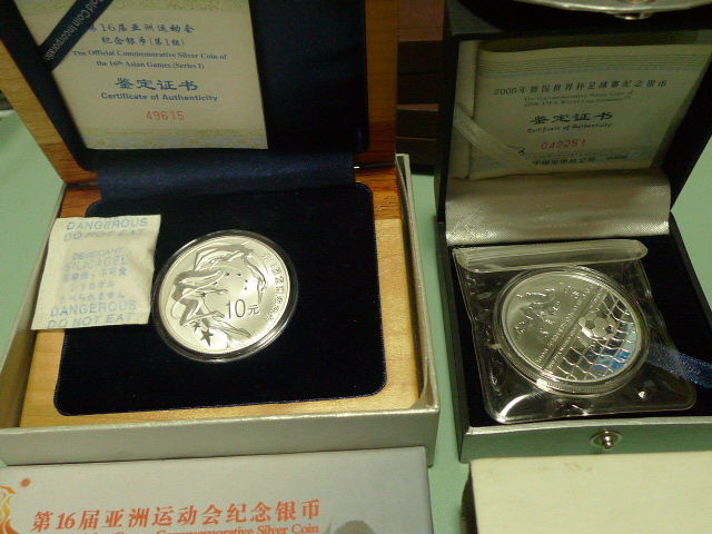 出售金币总公司封装19年扇形银猪2枚;世界杯银币一枚;16届亚洲运动会银币1枚。品如图,需者电联确认。