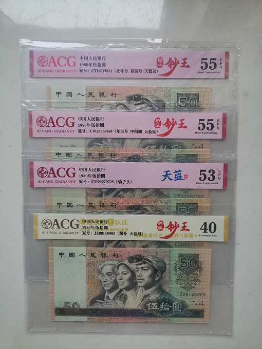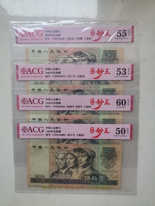8050共发行24个冠号,其细分品种天蓝冠只有CP、CQ、CR、CS、CT、CU和CW437以前的号段共计6个半冠号,补号为天蓝冠的只存在于JZ089以前的号段中,目前被业界公认为四版中的“背水”。本套8枚中除了首发冠CP和补号JZ外其余的6枚号码均不带4,补号的长度超过标准尺寸1mm(扫码可见),售价9188元。
