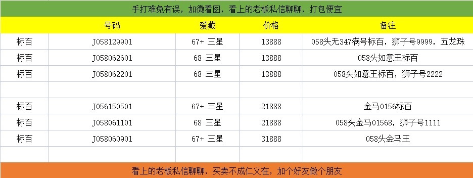 号码详细加微看图,手打难免有误,看上的老板加微15081377833聊聊,买卖不成仁义在,加个好友做个朋友,5刀打包113888