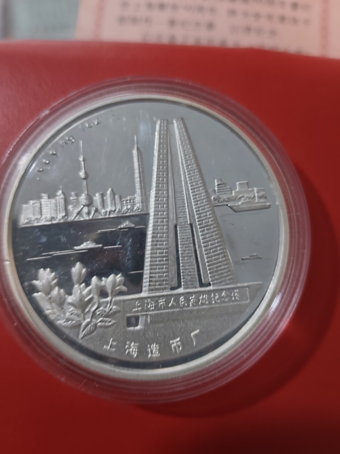 庆祝中华人民共和国成立五十周年暨上海解放五十周年,上海市委上海造币厂发行了一枚银质纪念章。成色999重量一盎司,仅售880元