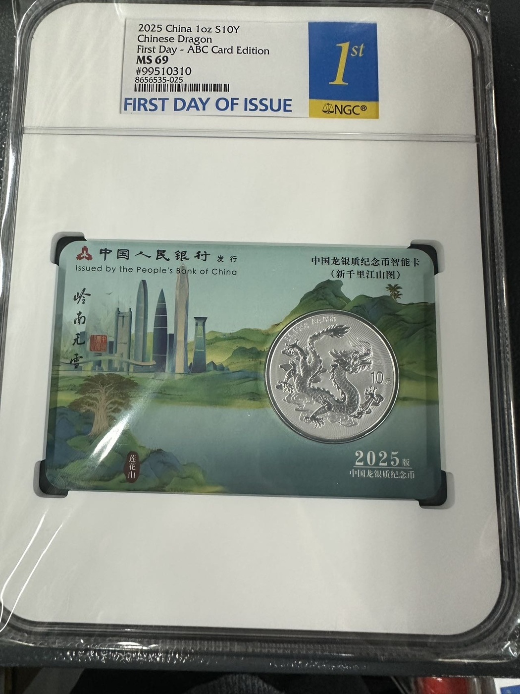 中国龙银币农行卡,千里江山图,NGC69分金兰首日标,