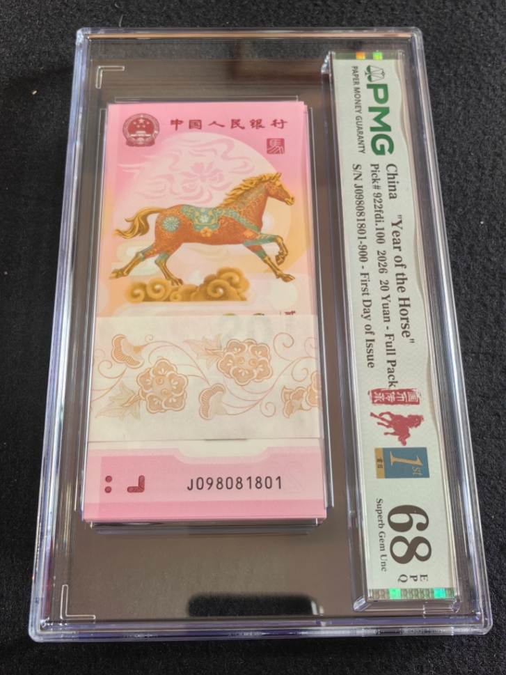 马钞PMG首日标:0158头金马车601,0189倒置801。