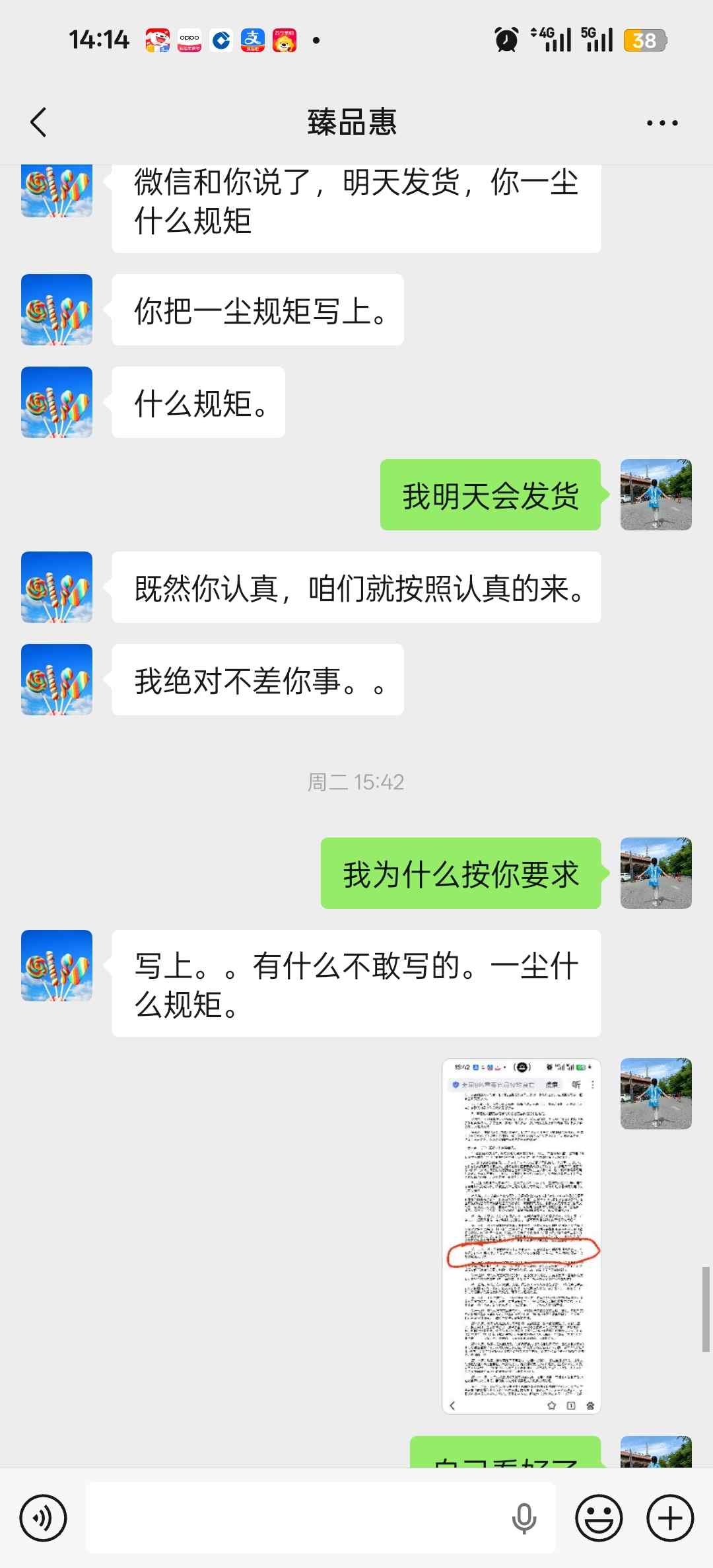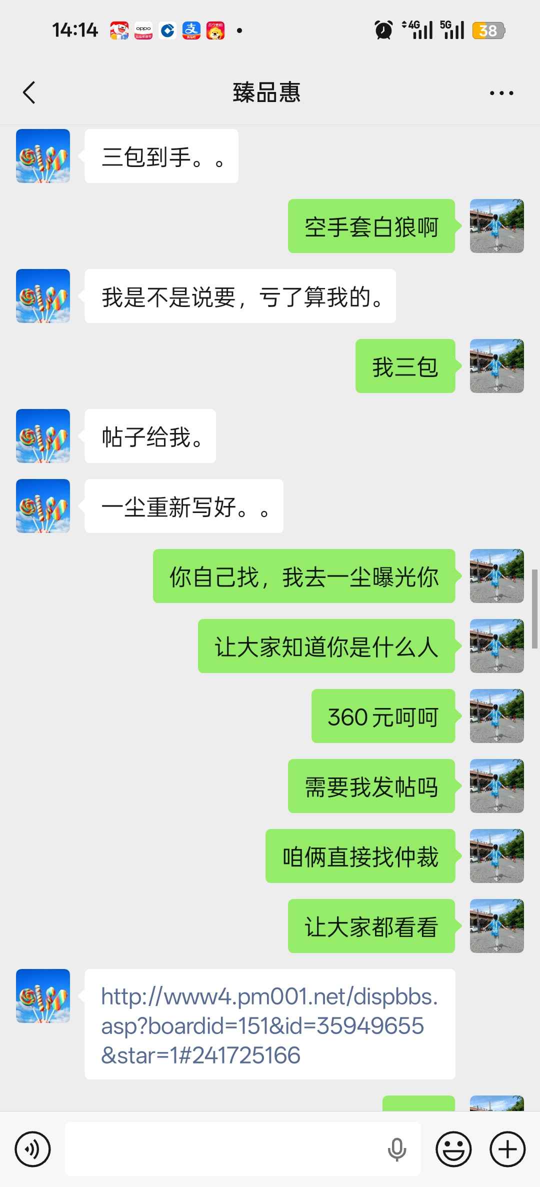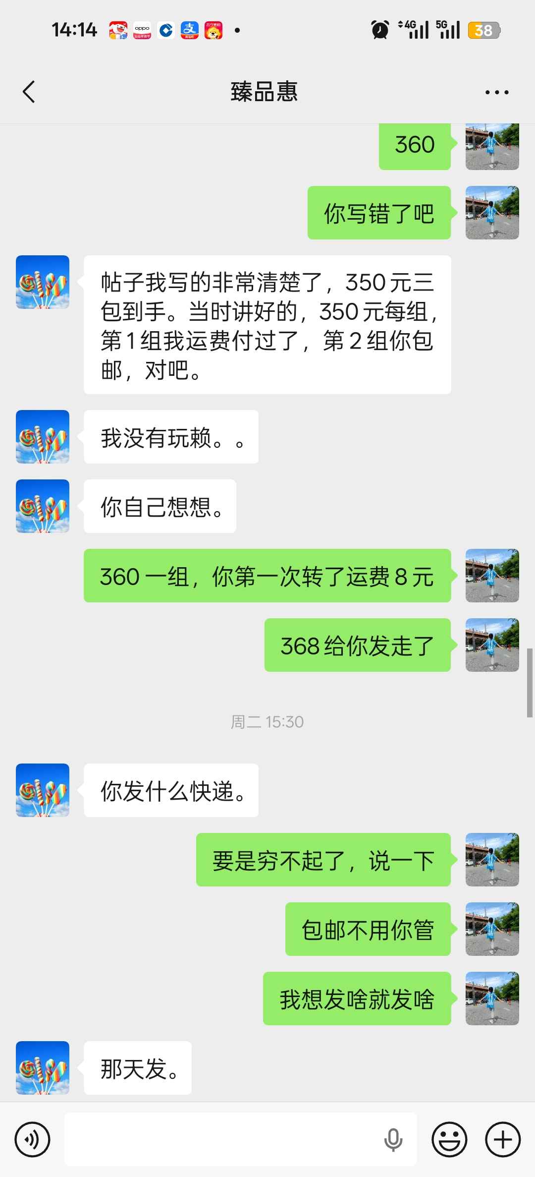 此人一尘确认我两组马钞全偶标十,一开始不给我钱,他什么时候卖出去,什么时候给我钱,第一单他卖出去了,给我钱了第二单没卖出,就不给我钱,我问题要钱,要要取消交易,我说按一尘规则走,他勉强打款让我发货,关键才360元还想挂账,实在想不明白,但后来我发货给他后,他收到货后又投资物流说人家发违禁品,要求赔偿200元,我就想想问,如果大家都学他,谁还敢发纪念钞,谁还敢交易,请版主及大家评理 谢谢!