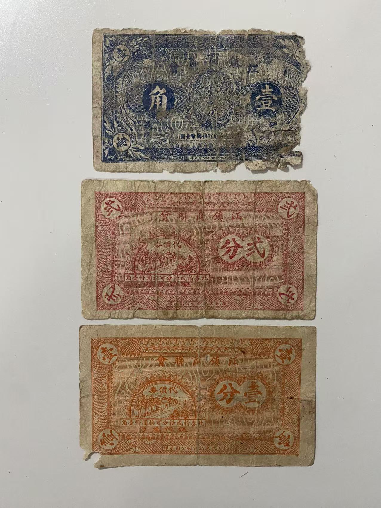 → 江镇商联会代价券3张.壹角.贰分.壹分