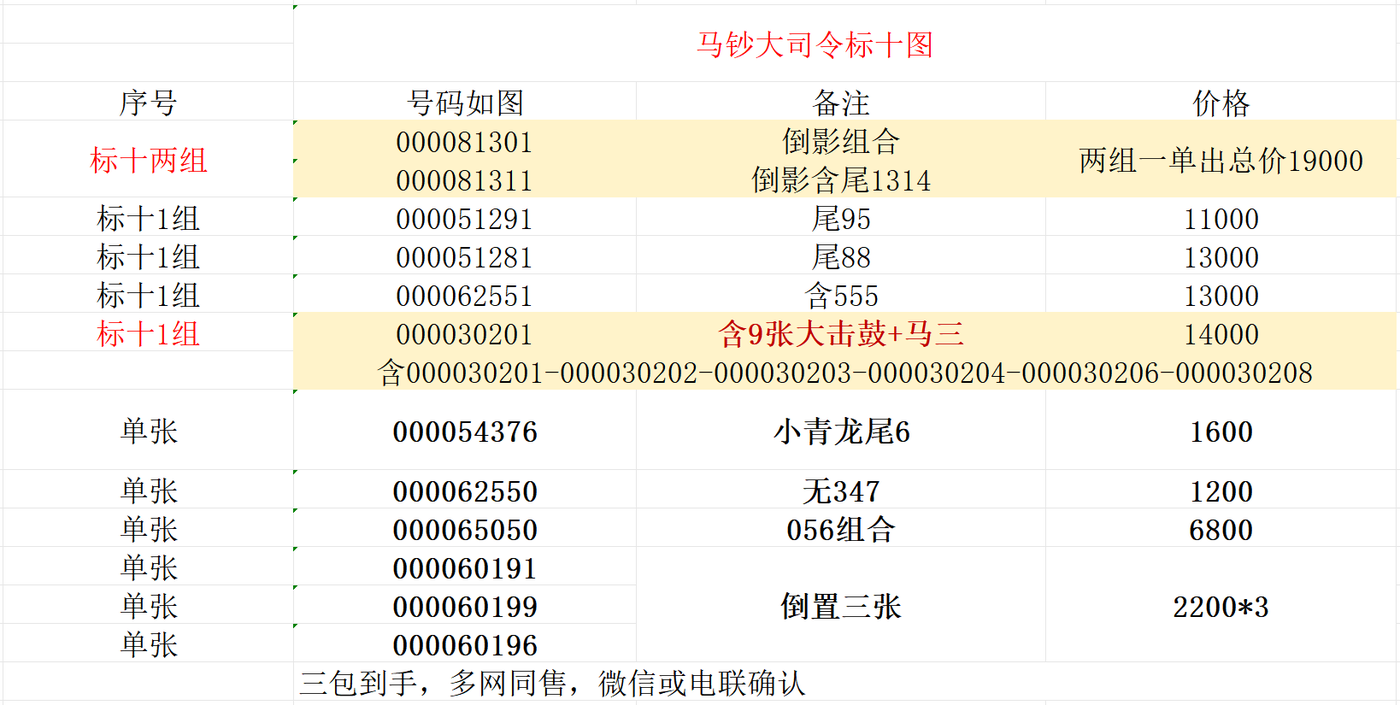 售《马钞大司令标十》————号码如图