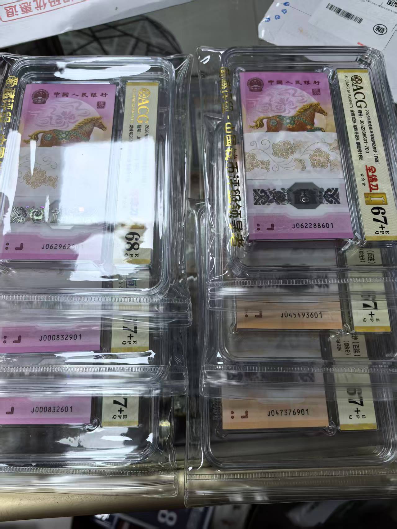 马J062962801爱藏68分首日全满801售17800元,马J000832901爱藏67+首日全满小司令901售10800元,马J000832601爱藏67+首日全满小司令601售10800元,马J062288601爱藏67+首日0268全满601售22800元.龙J045493601,J047376901两刀一起16300元一刀。