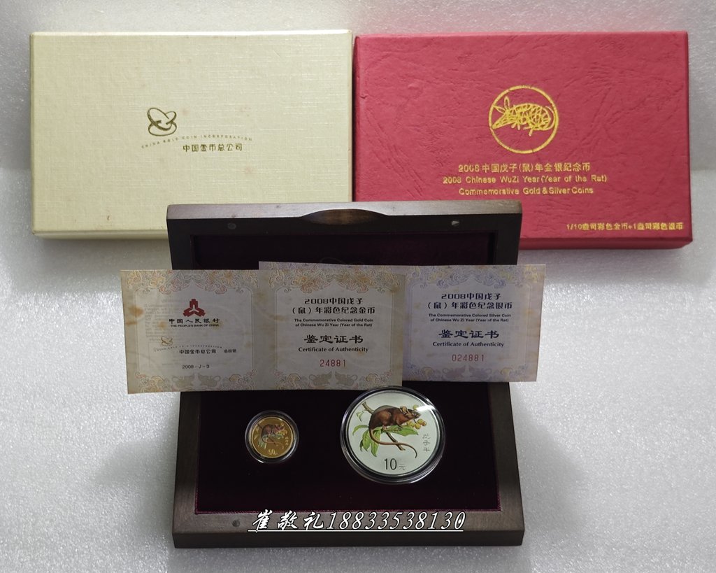 2008年彩金银鼠1/10金+1盎司1套:5350元包快勿议,配件齐,证书外盒有黄尽显沧桑币无磕碰无划痕正常微氧,,