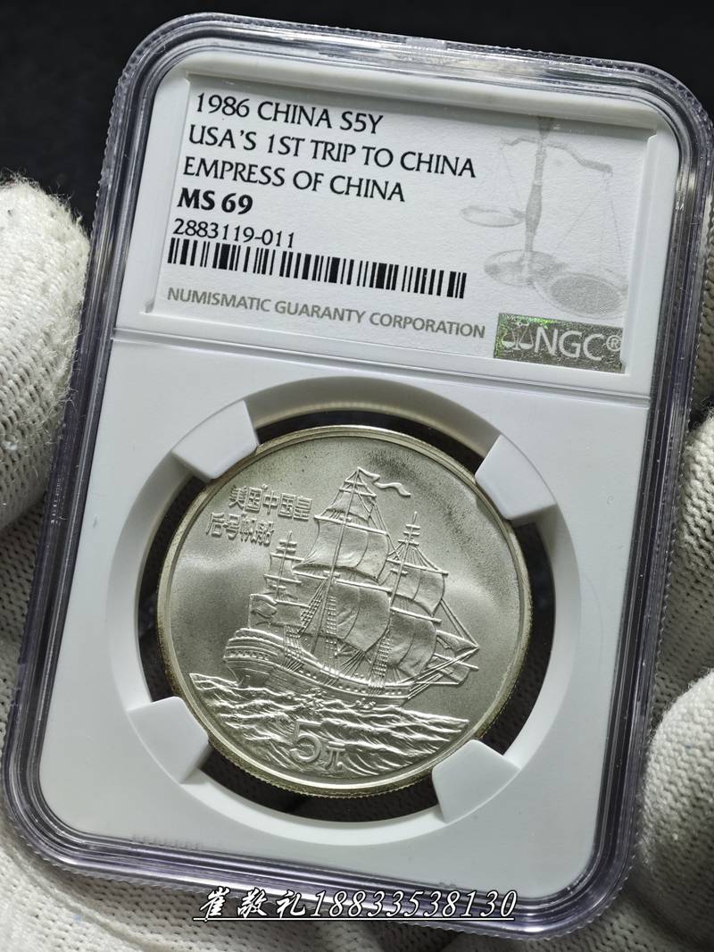 1986年美国“中国皇后号”帆船首航纪念银币 NGC MS69