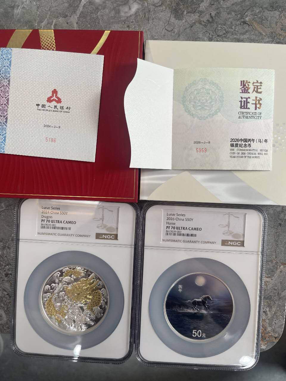 2024年生肖龙年50克银币+2026年生肖马年150克银币,Lunar Series,官方发行,评级封装,品相全新未拆封,原装评级盒+鉴定证书齐全