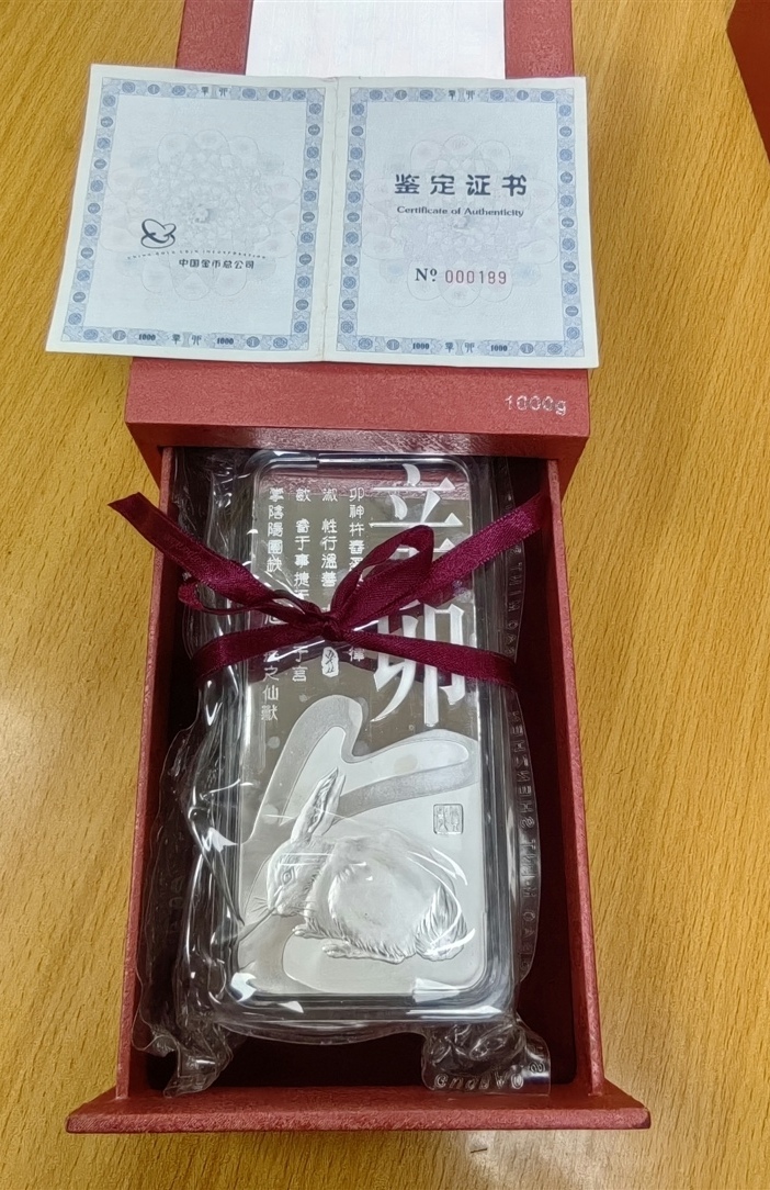 → 金总1公斤生肖银兔一个,证书盒齐,证书000189小司倒置号