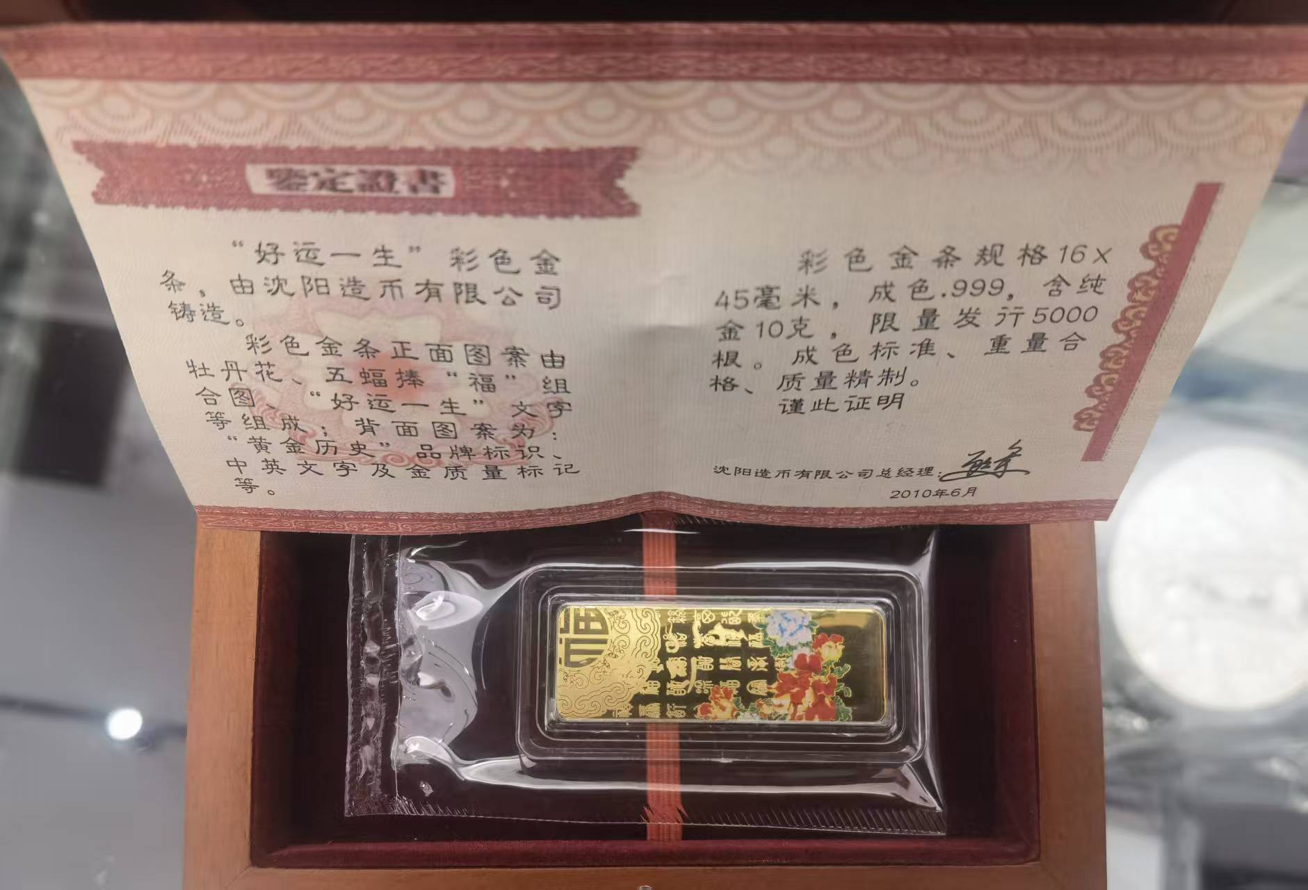 1160克价,包顺丰,1根是中国银行出品,1根是“黄金历史”沈阳造币有限公司出品的“好运一生”彩色金条,具体看图