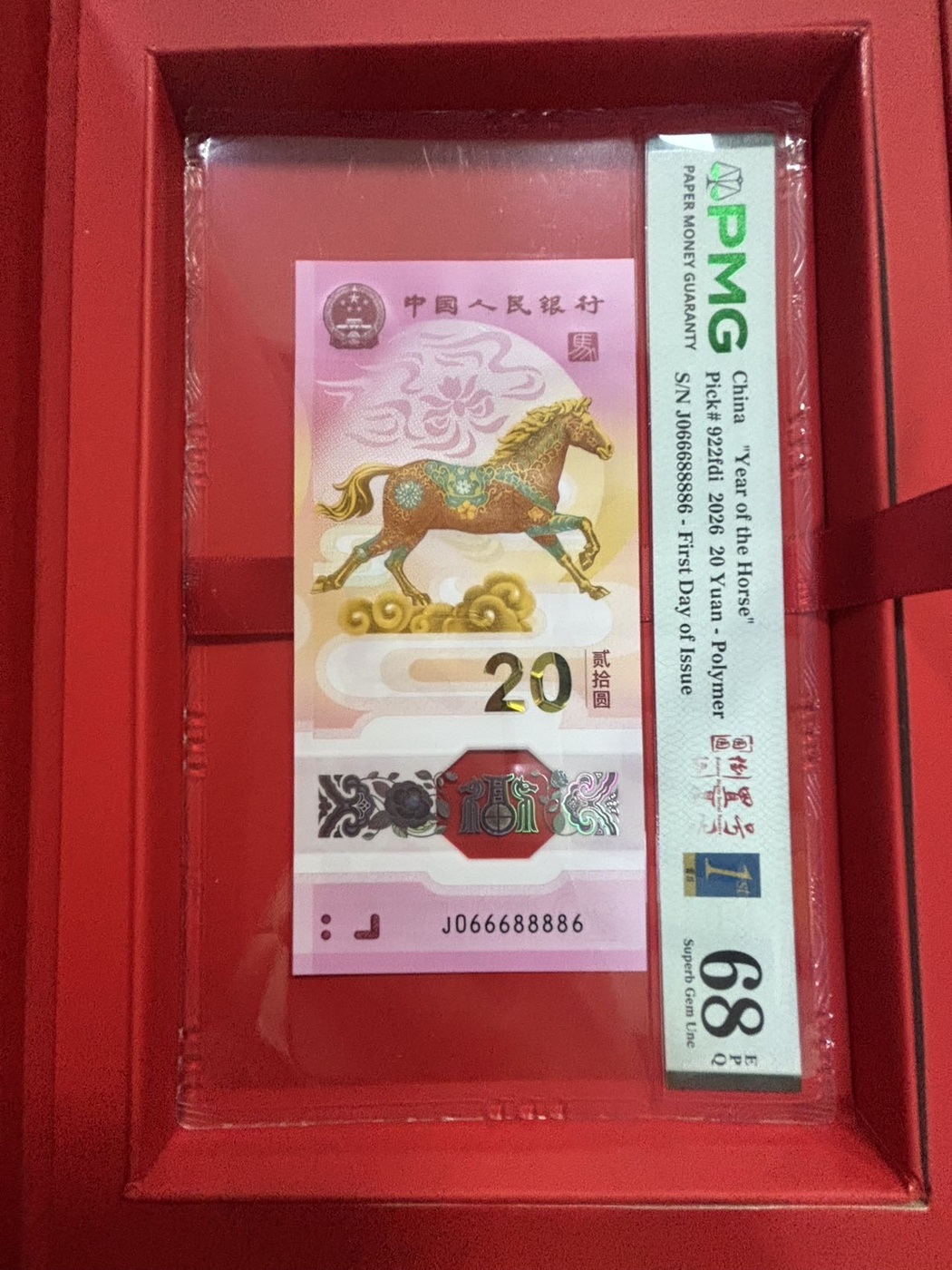 马钞J066688886 PMG68分,大三圆圆圆倒置首日金兰老三标狮豹组合,售价12800元