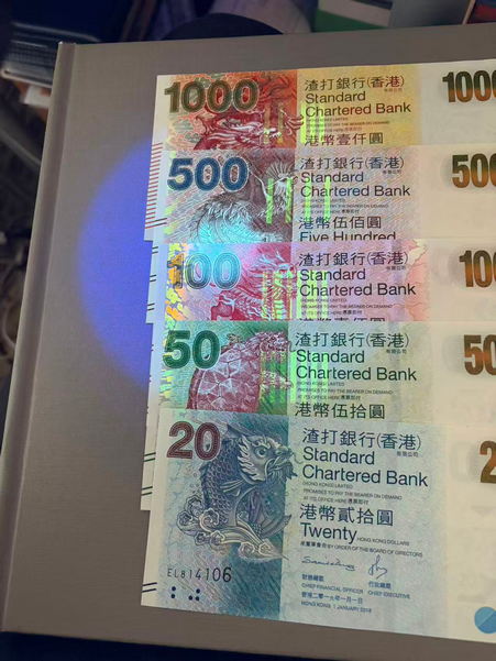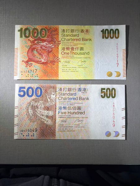 香港渣打银行20元、50元,100元、500元、1000元面值各两张,都是全新挺版的,高档册子抽出,两套总面值3340元