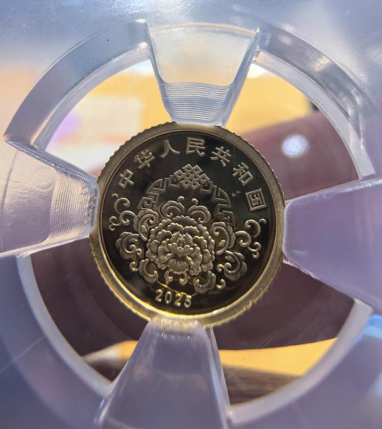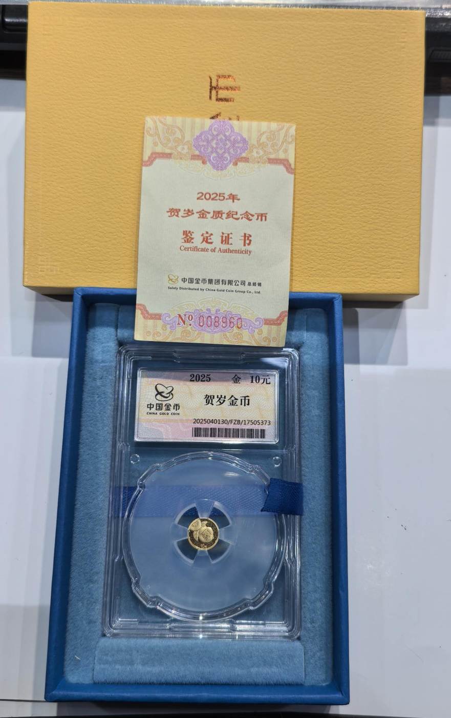 2025年贺岁金质纪念币,1克圆形封装金币,10元面值,中国金币总公司封装,带原装盒子和鉴定证书,证书号清晰,证书圆圆号,品相完好,未流通,1400元