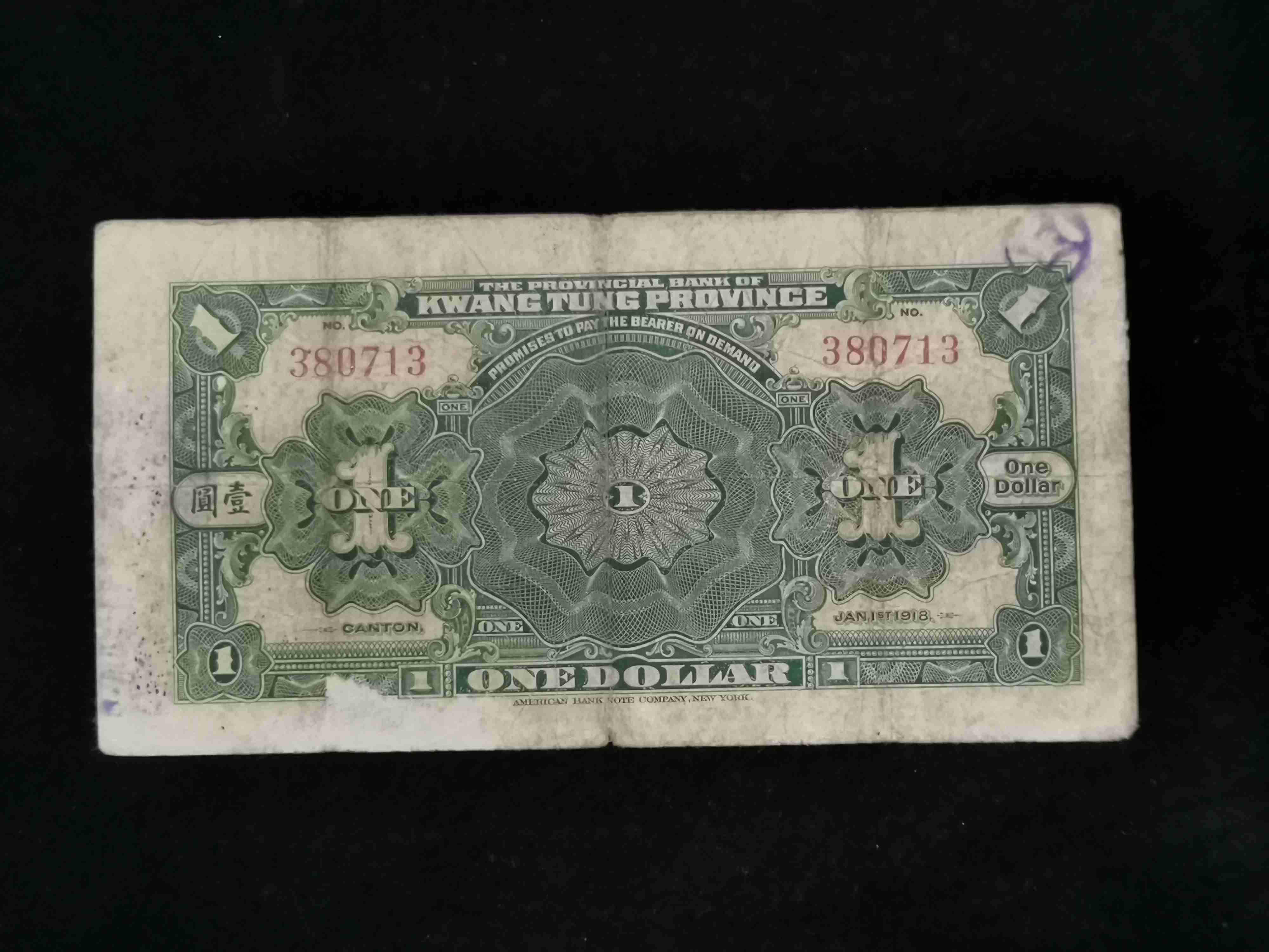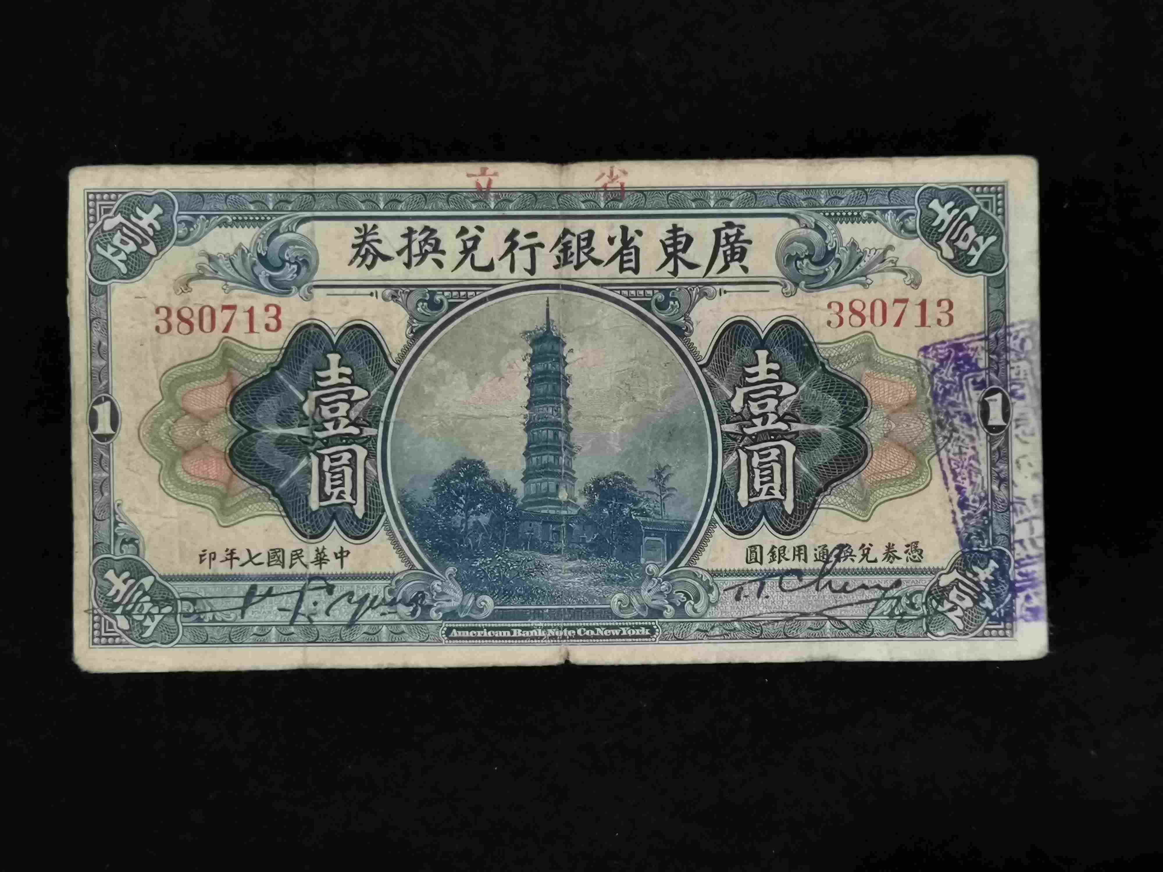 → 民国七年广东省银行兑换券壹圆 1张