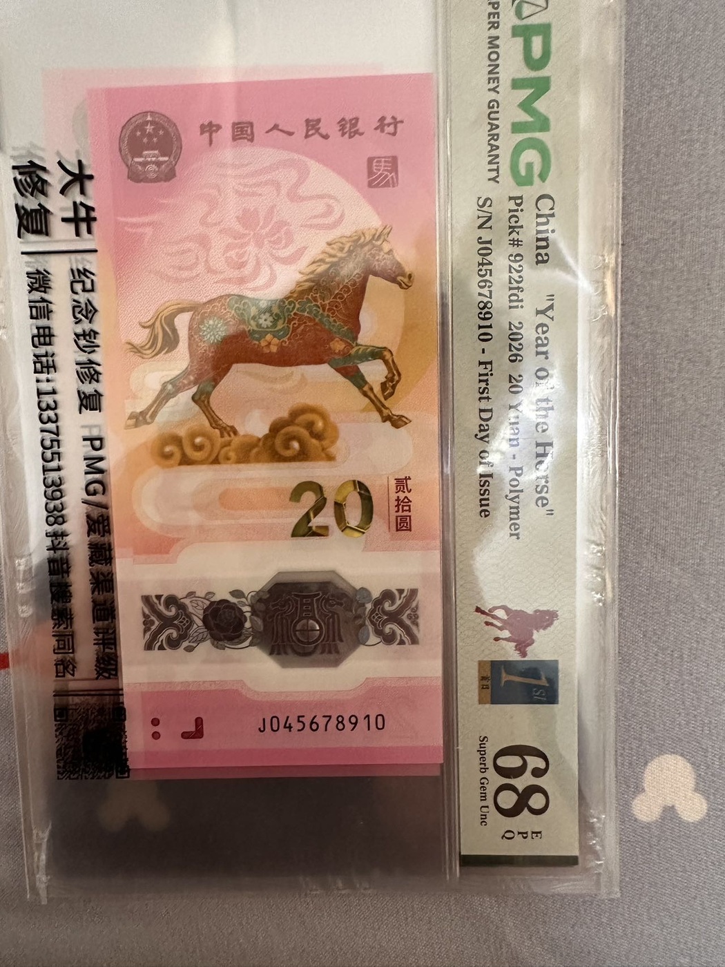 → 出马钞04578910,顺子号,首日68