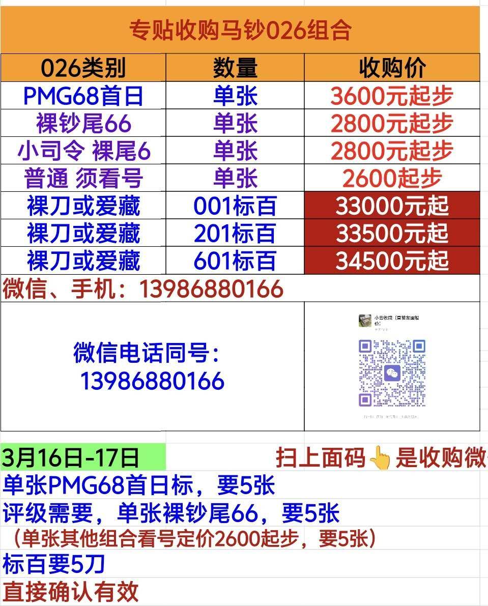 ■3月16-17日 专贴收购马钞026 单张标百及PMG