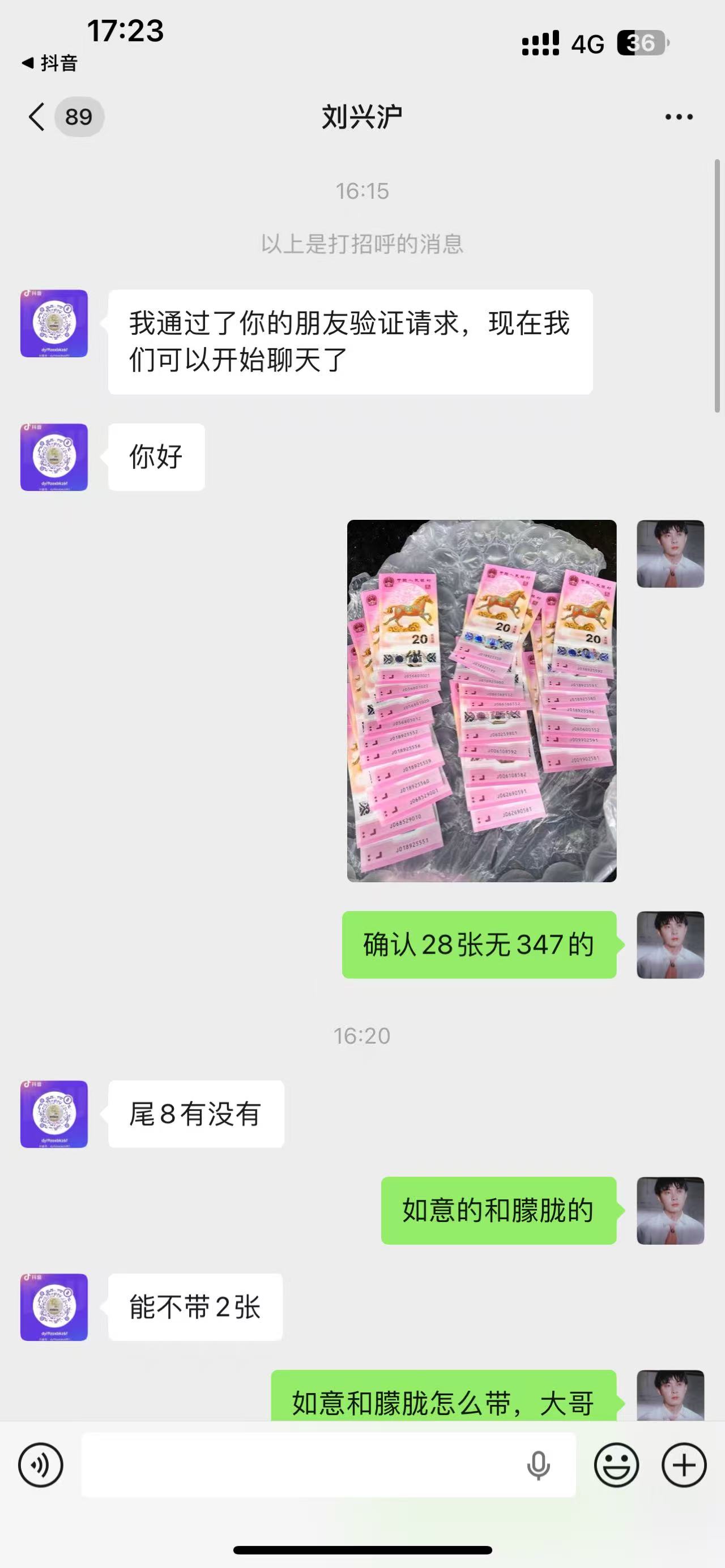 南充老刘发布先款82收马钞无347,我跟帖确认28张,然后微信发图,让我带2张尾8,我说只有如意和朦胧,不合适,价格有差距,然后就不想要了,各种找借口,说某藏有我号码,我让他开视*频看图,他拒绝,情况非常清晰明确,请版主裁决,还大家一个良好的交易环境,清楚蛀虫,帖子地址http://www2.pm001.net/dispbbs.asp?BoardID=151&ID=36066678&replyID=&skin=1