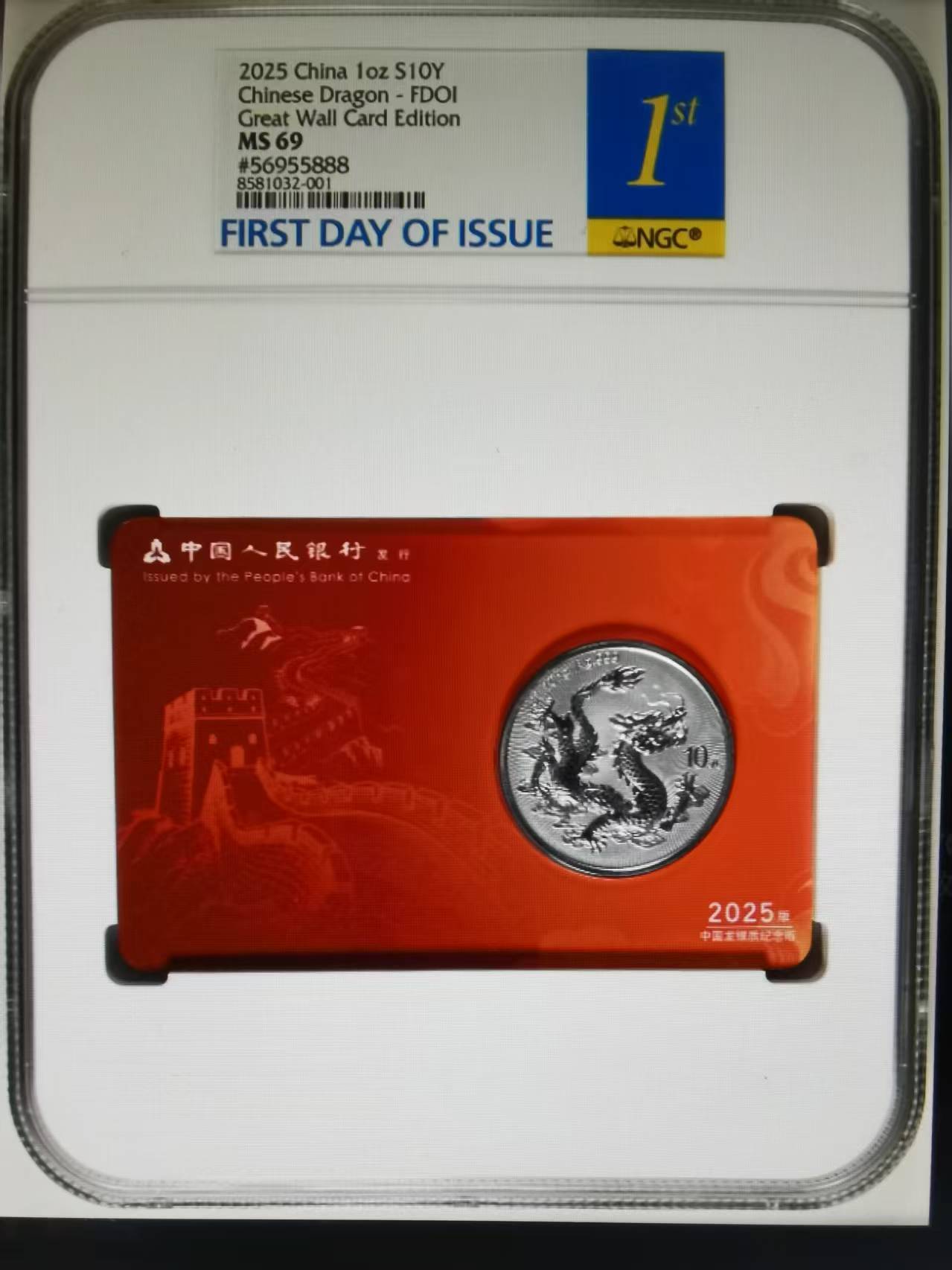 二、出中国龙银币NGC评级首日金兰标69分朦胧号尾88智能卡一枚,