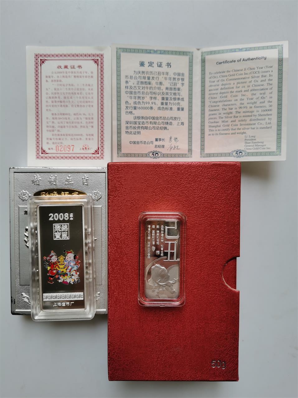 15克9枚,80克3枚,31克2枚。上海造币厂2008年“锦鼠聚宝”88克银条一根 中国金币总公司2009年牛50克银条一根