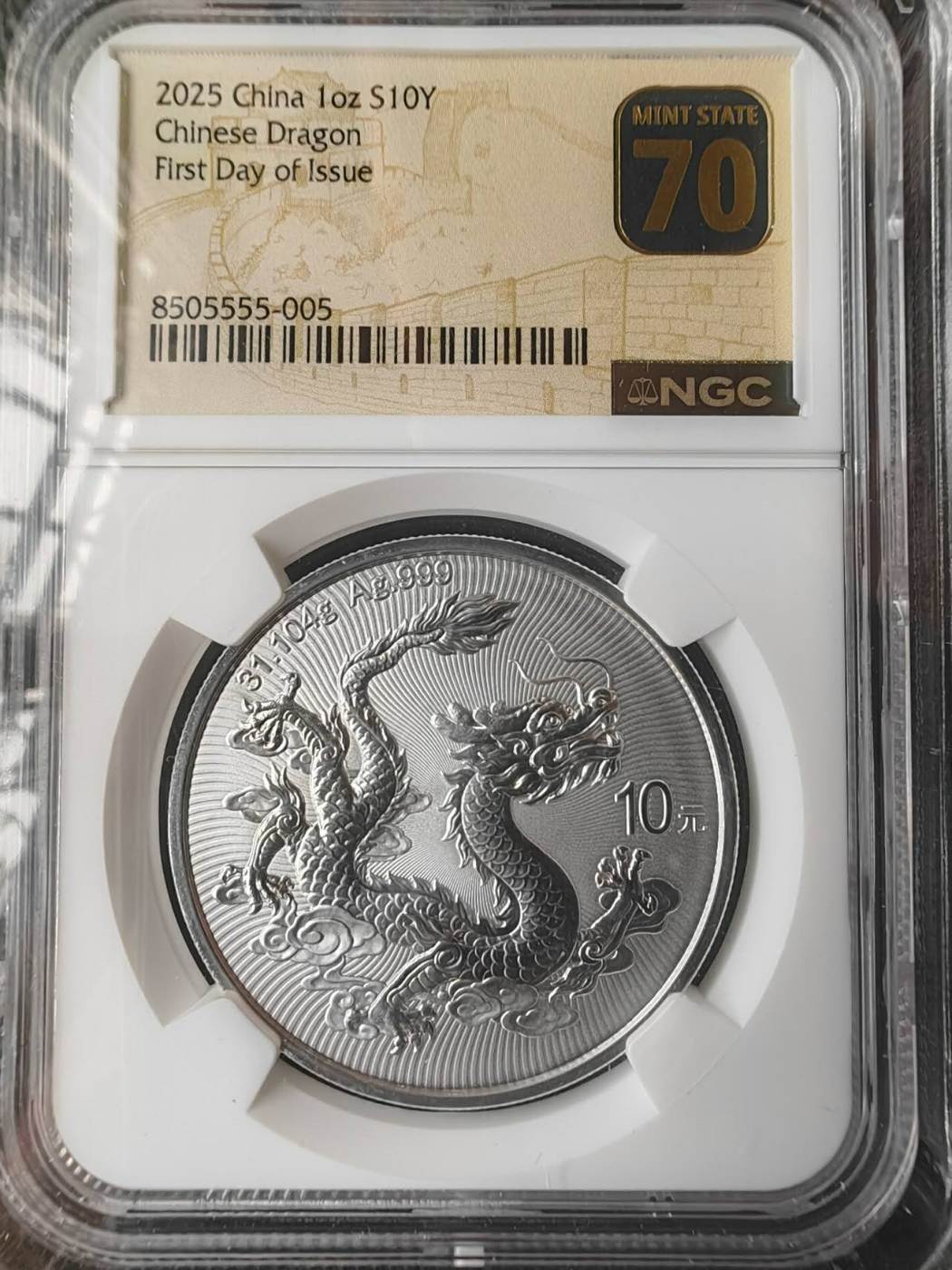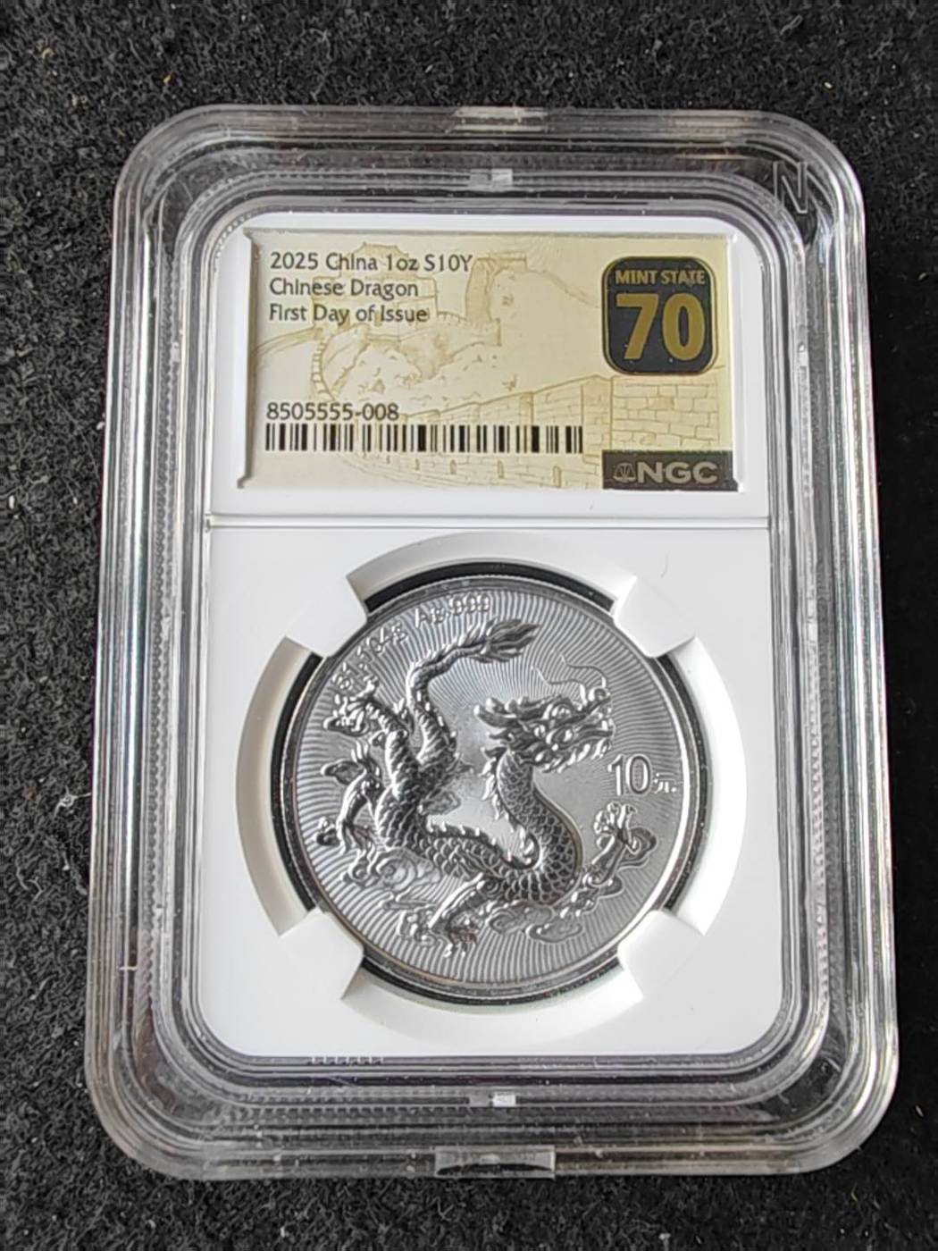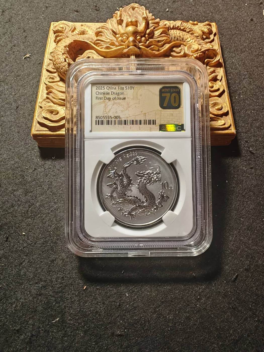极品2025中国银龙纪念币银尾龙。首日黑金长城英语金标NGC70,稀少串号8505555-005和008,金马王058龙三。单银尾。