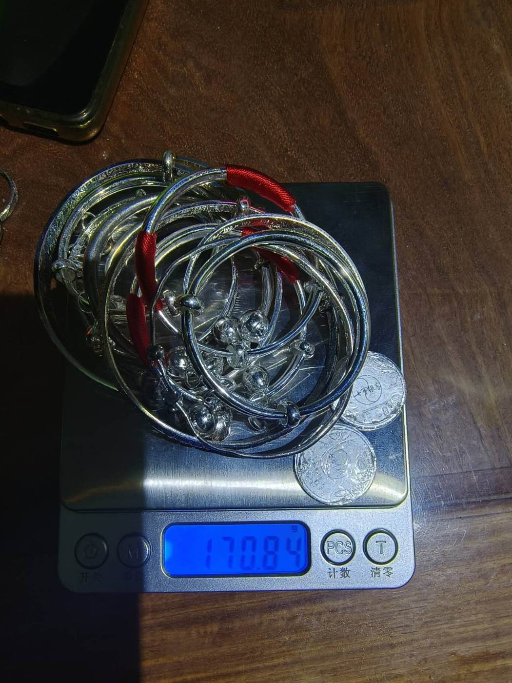 18出银镯子11个,七宝酒业7克银币两枚共170.8克按170克结算,925银戒指项链8.75克按15一克15*8=120,真银假*币袁大头3个400一个,合计18*170+15*8+3*400=4380,一起出,款到明天上午包顺丰