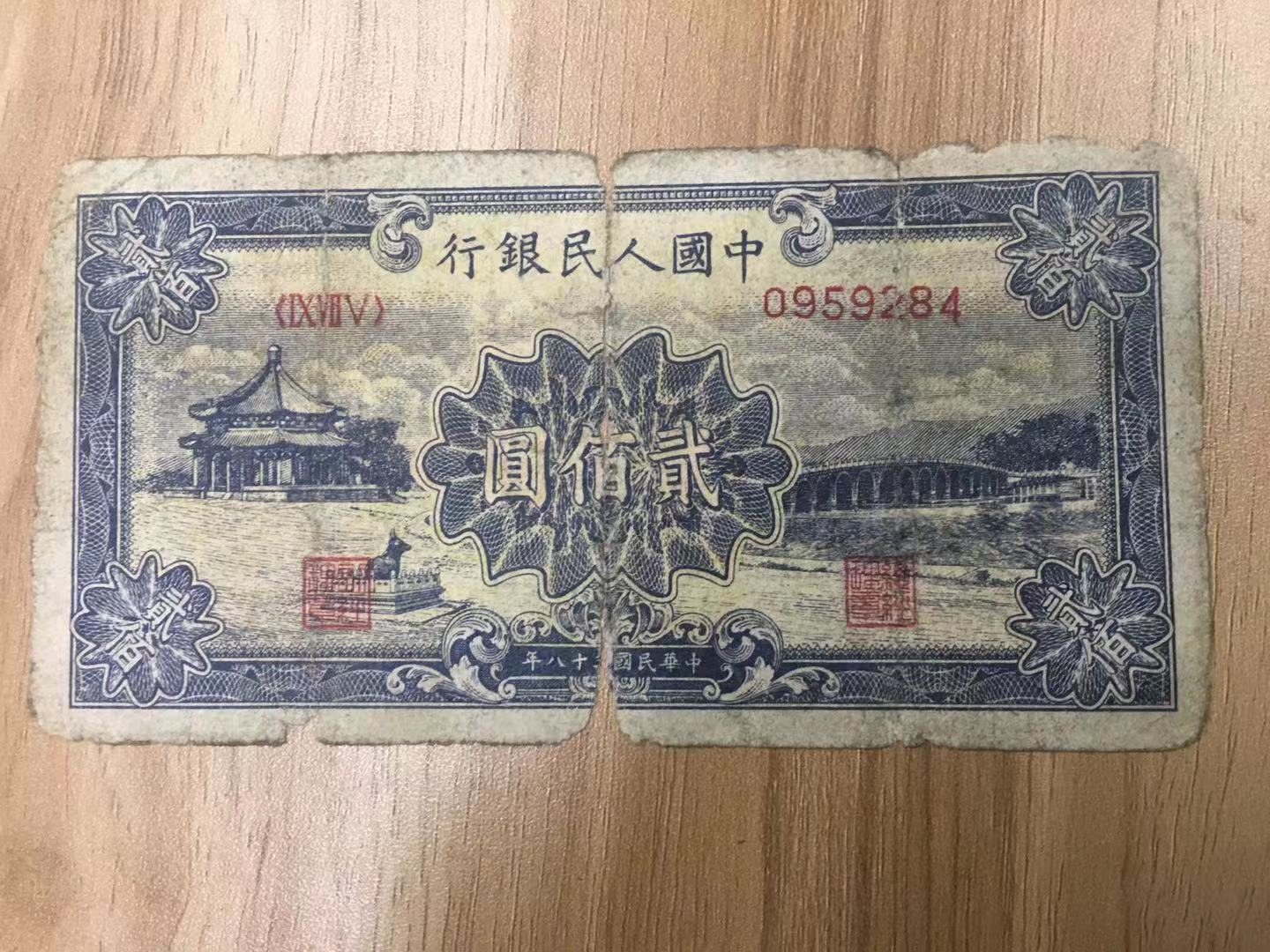 → 原票第一版人民币;贰佰元颐和园
