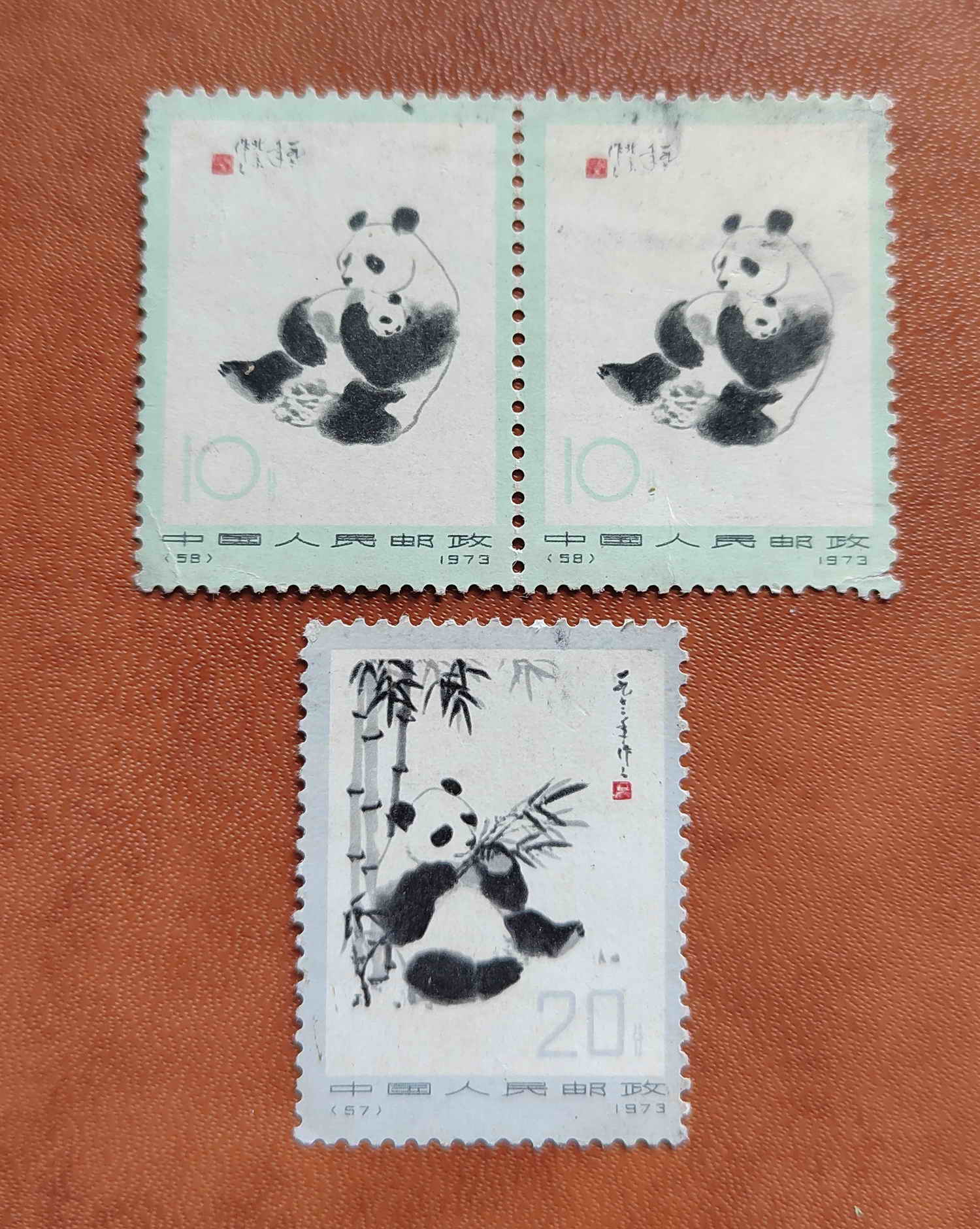 三张熊猫都有胶,面有脏(10分双联右边的右下角齿有撕裂)