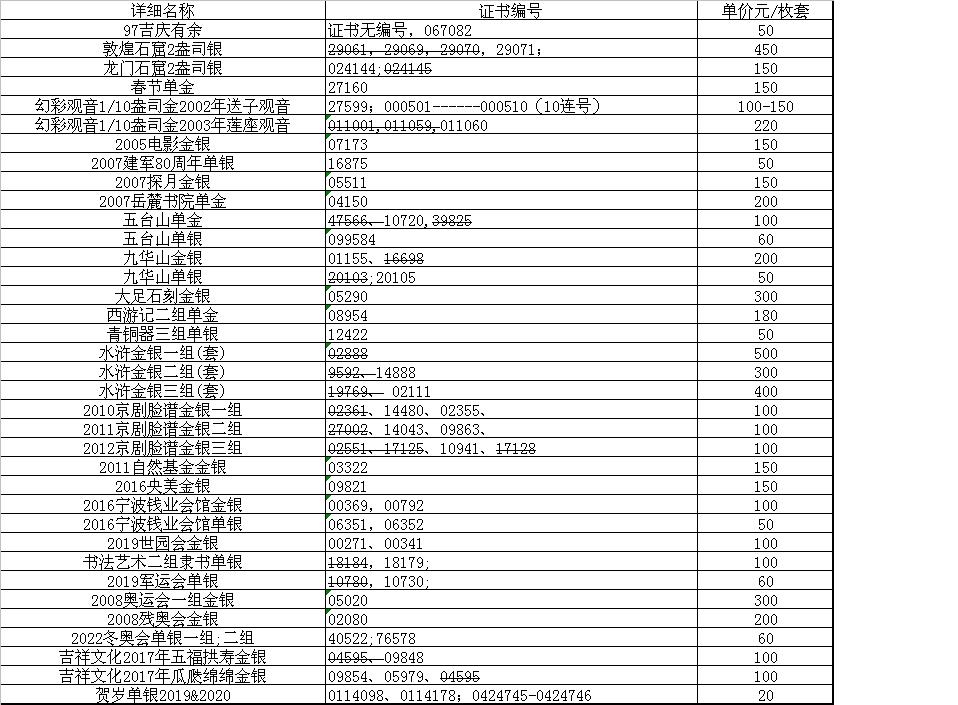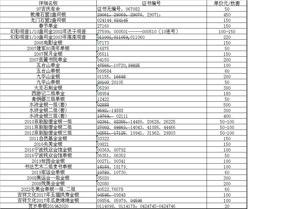 更新惠出部分金银币证书