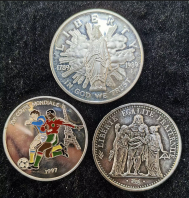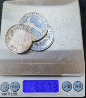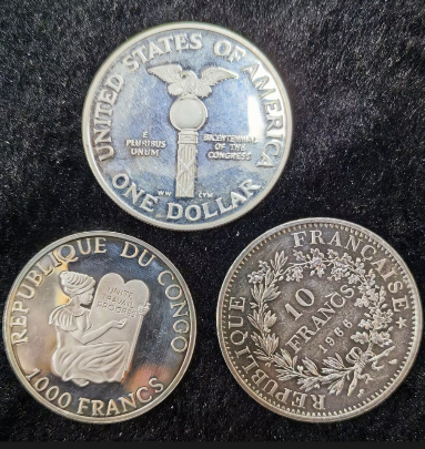 1997年刚果1000法郎15克含银量92.5%,1966年大力神25克含银量92.5%,1989年美国国会成立26.7克含银量90%,香港回归银章28.4克含银量92.5%,四枚共95克