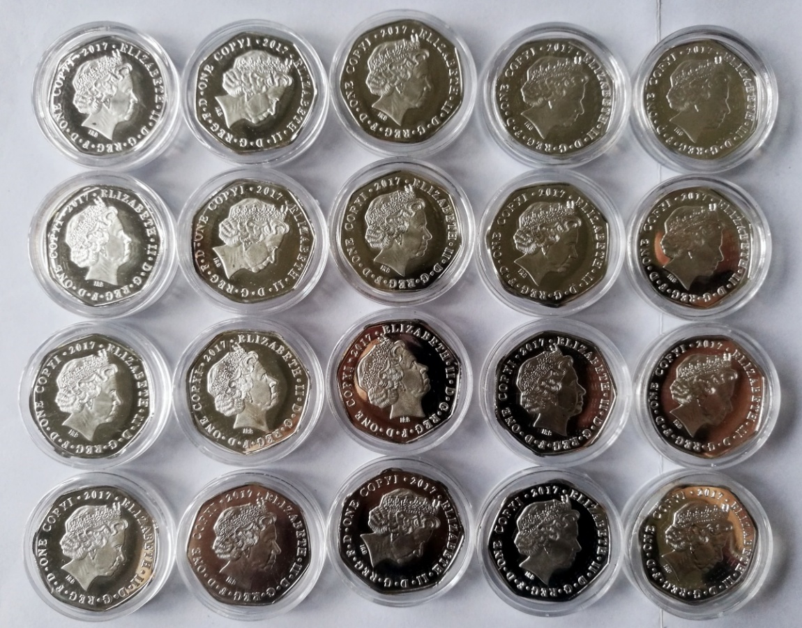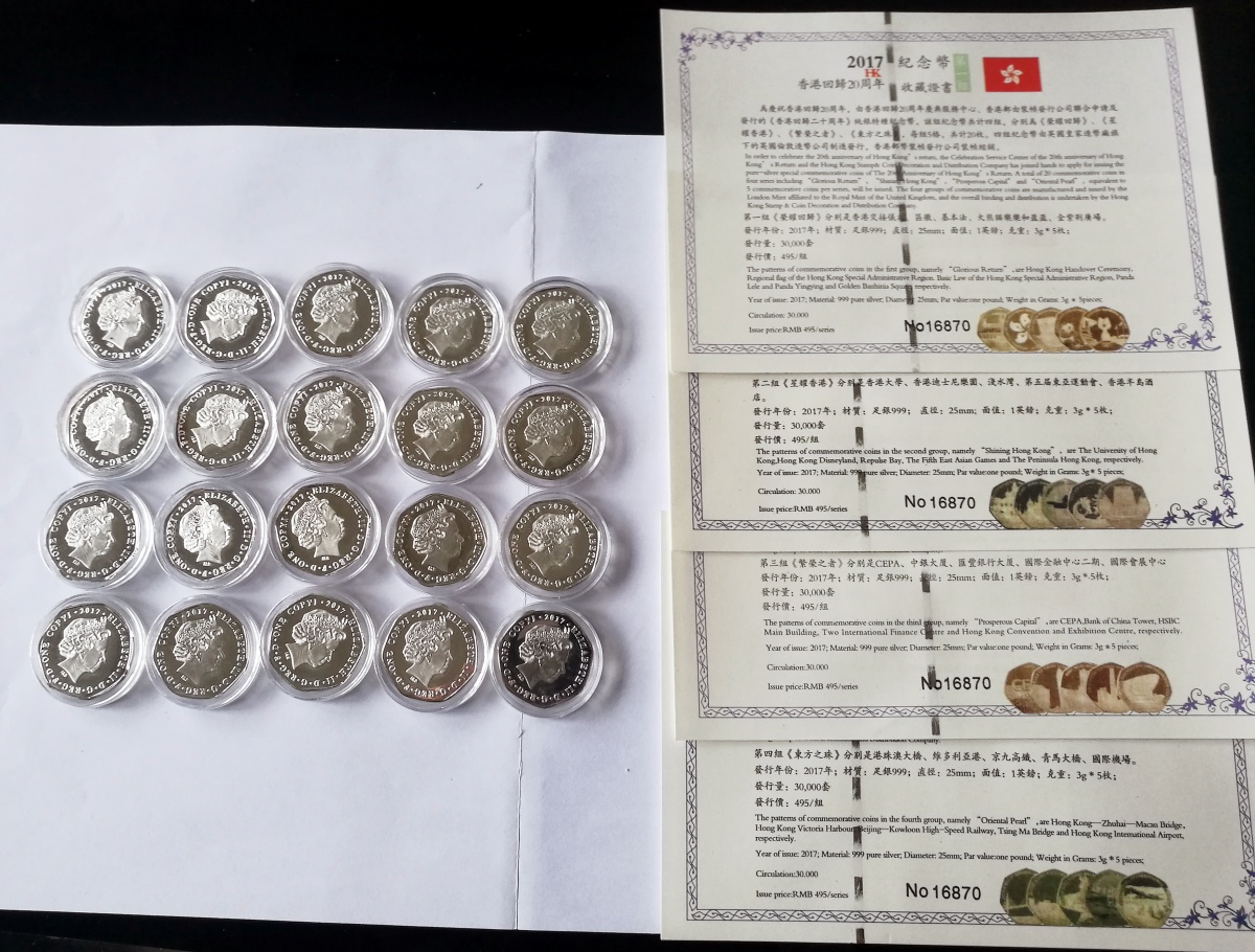 2017香港回归20周年999足银纪念币一套,四组20枚。 每枚3克纯银铸造,面值一英镑 ( 1*20枚)20 英镑,总重量60克纯银。 由英国皇家造币厂旗下的英国伦敦造币公司装贴发行,工艺精良。全球发行3万套,市场难得一见.