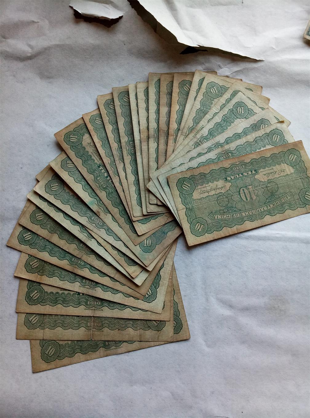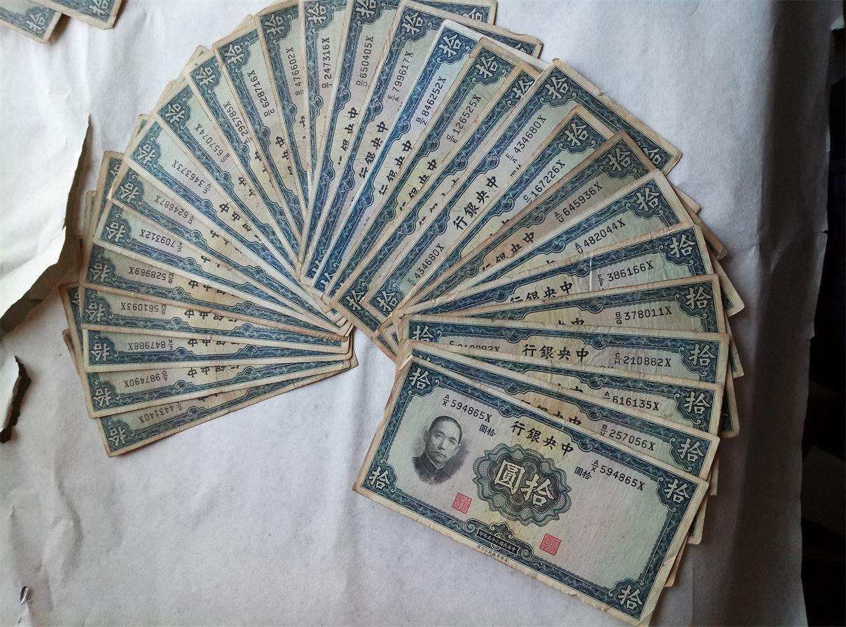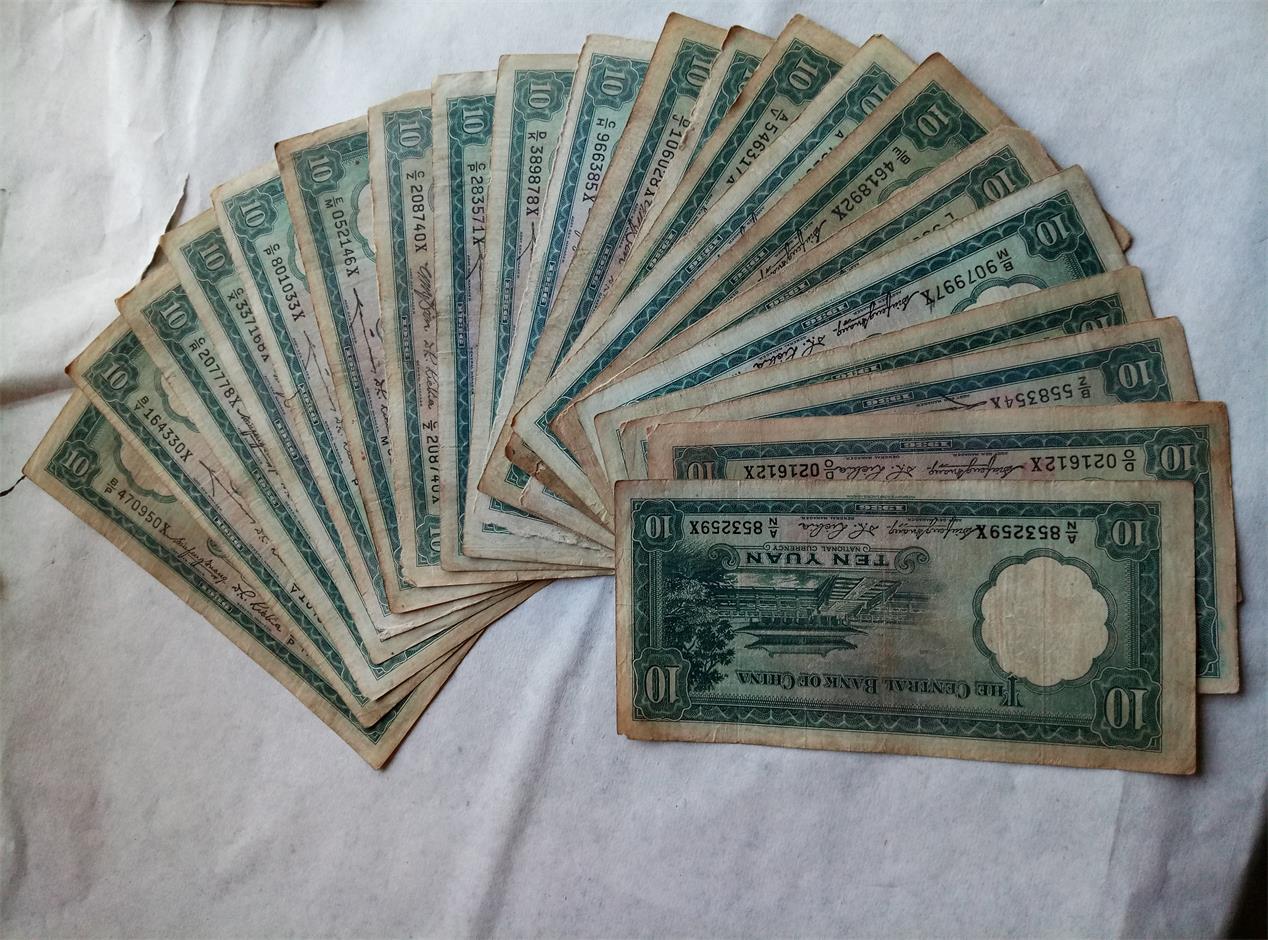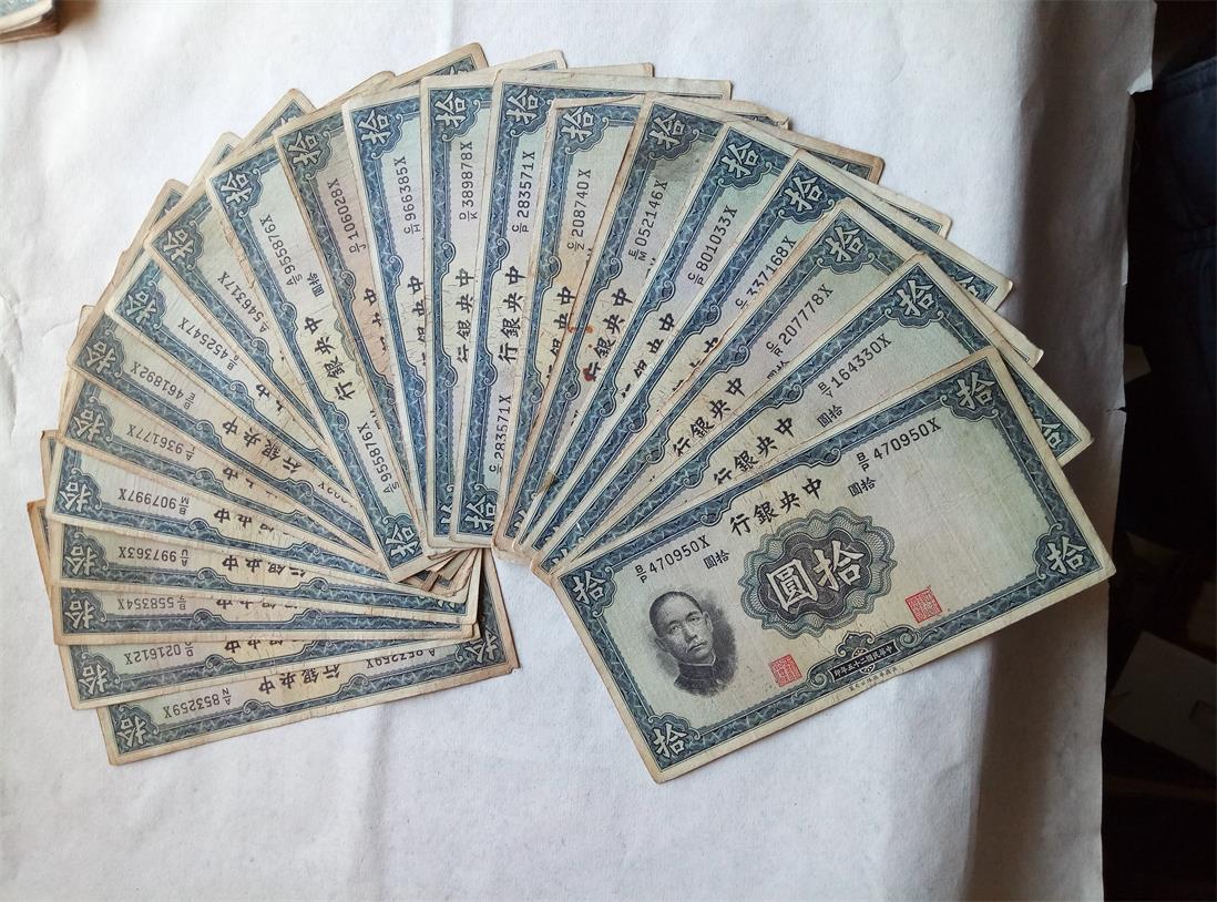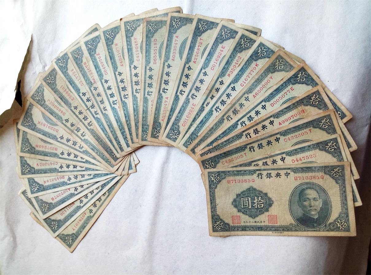 品如图。中央10元民国25年英国华德路公司印49张,中央5元民国25年英国华德路公司印16张。中央5元民国25年德纳罗公司印19张。中央10元民国29年中华书局印26张.好品原票。一共110张36元一张一起走。包顺丰。