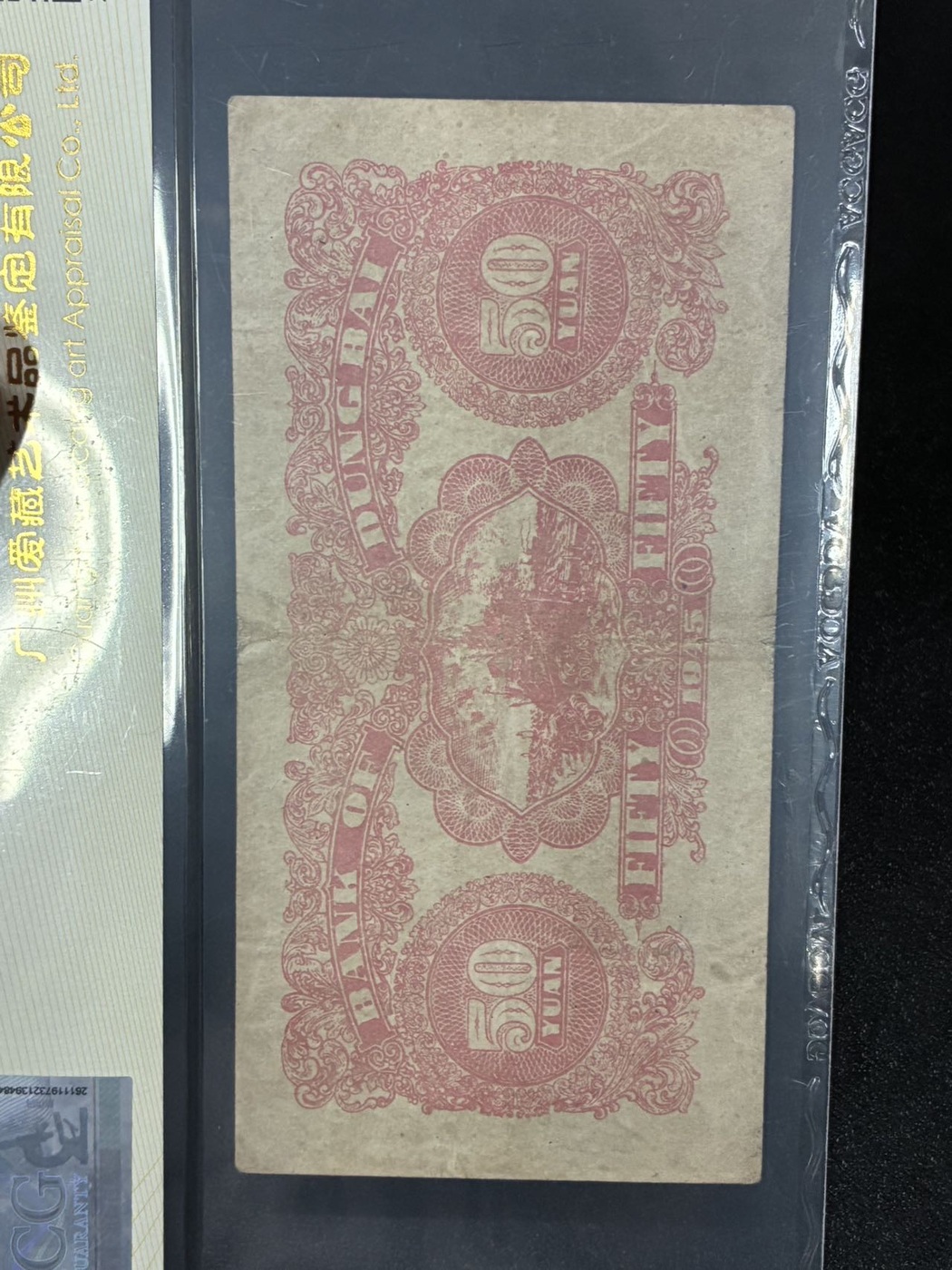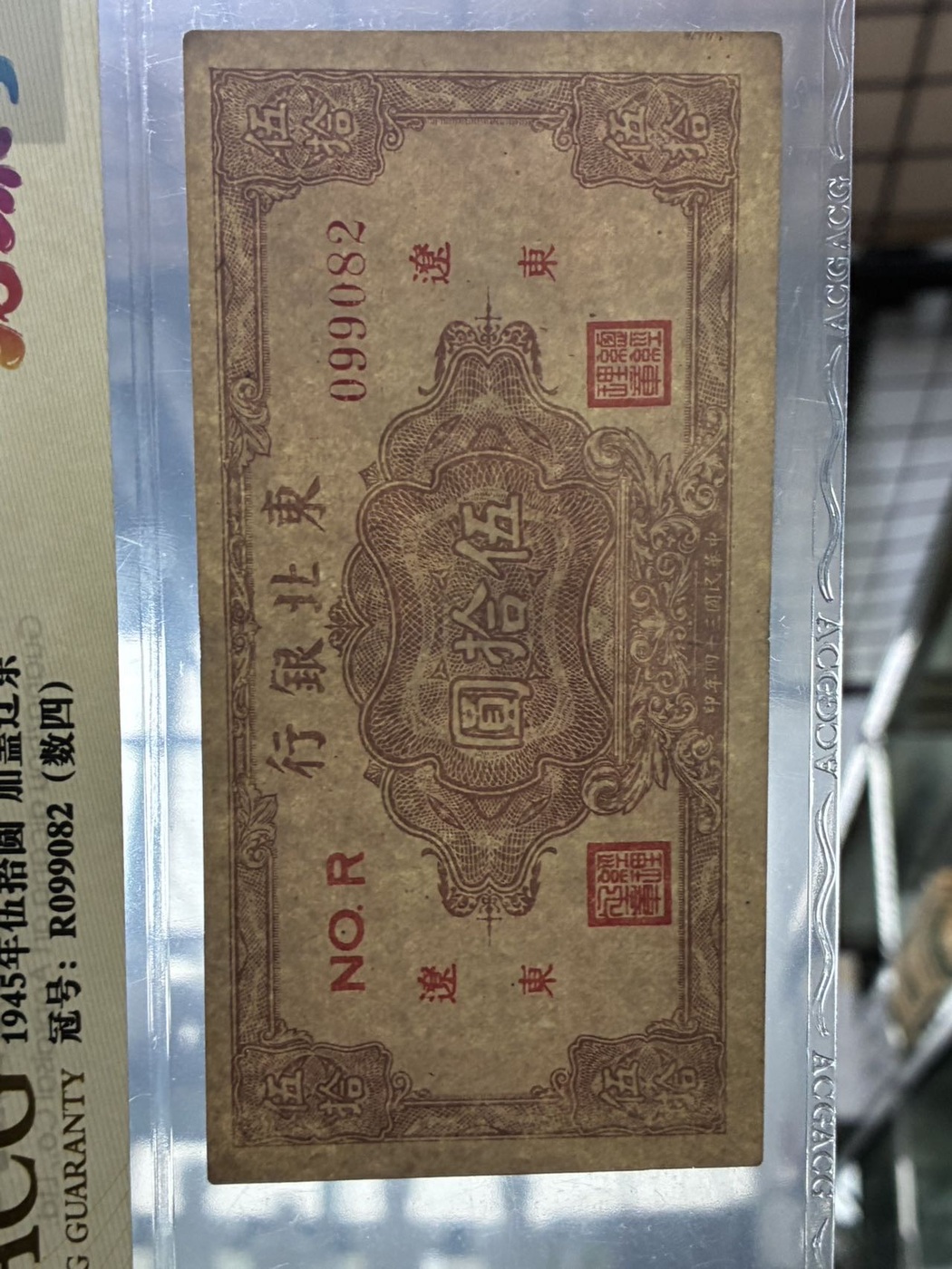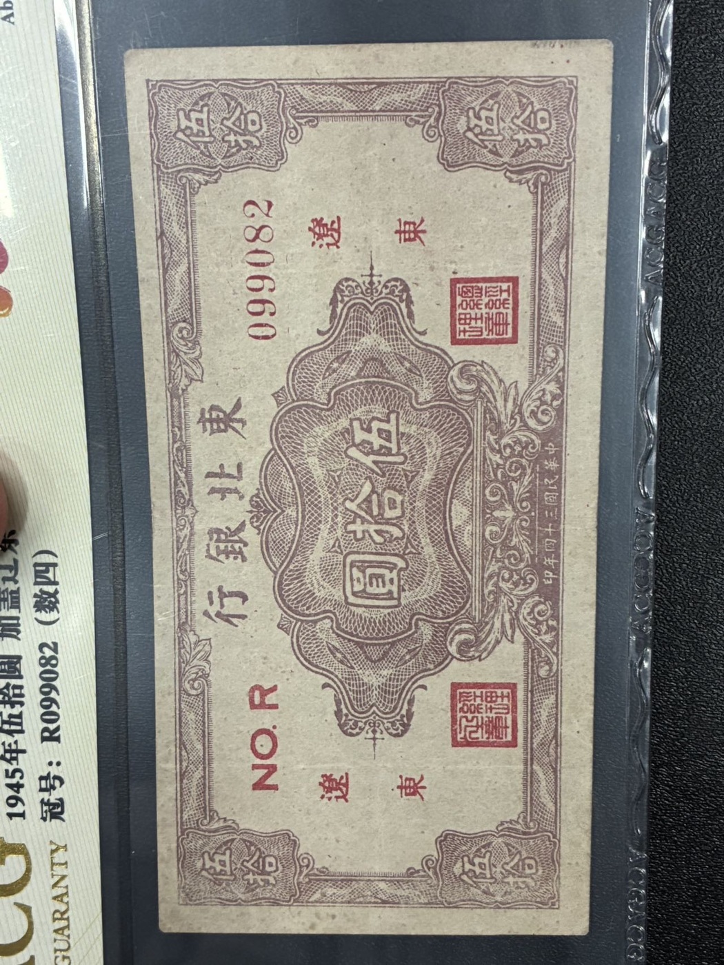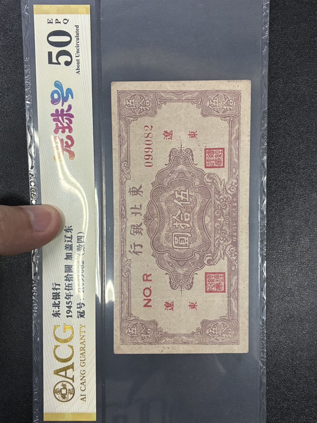 → 东北银行50元加盖辽东,民国34年,龙珠号 爱藏评级50EPQ;无347