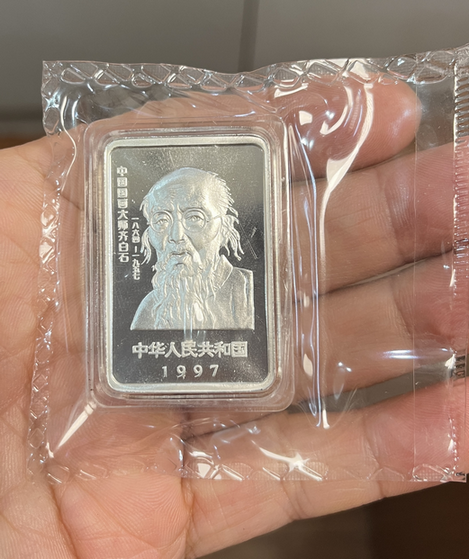1997年齐白石银币一套,银币正常轻微氧化,原盒原证原封,证书微黄号码:03769!