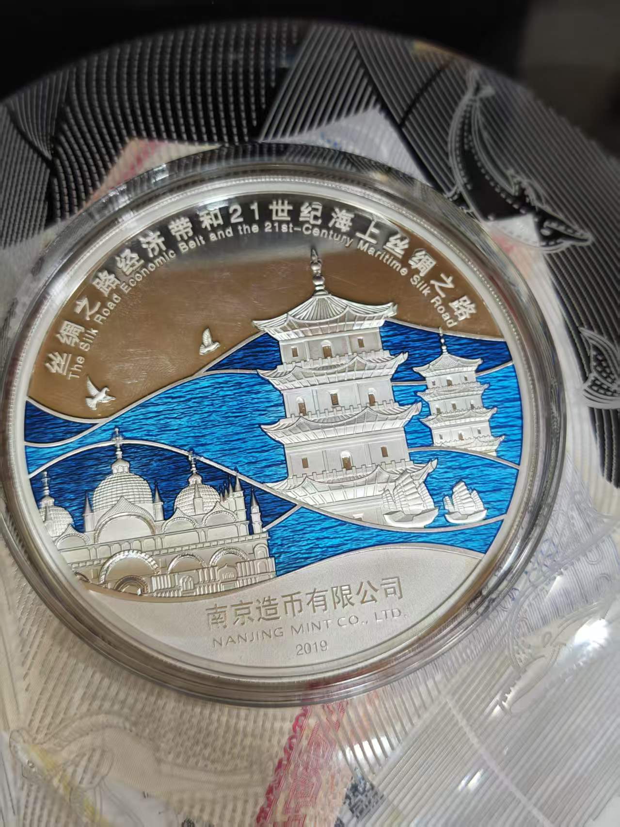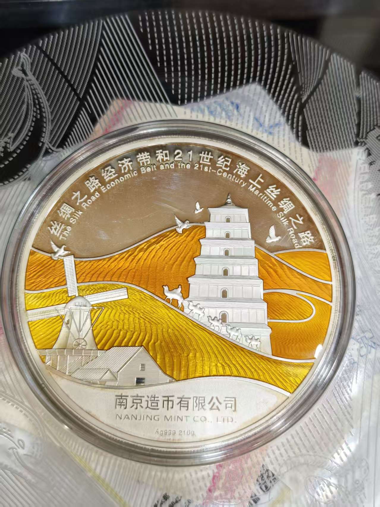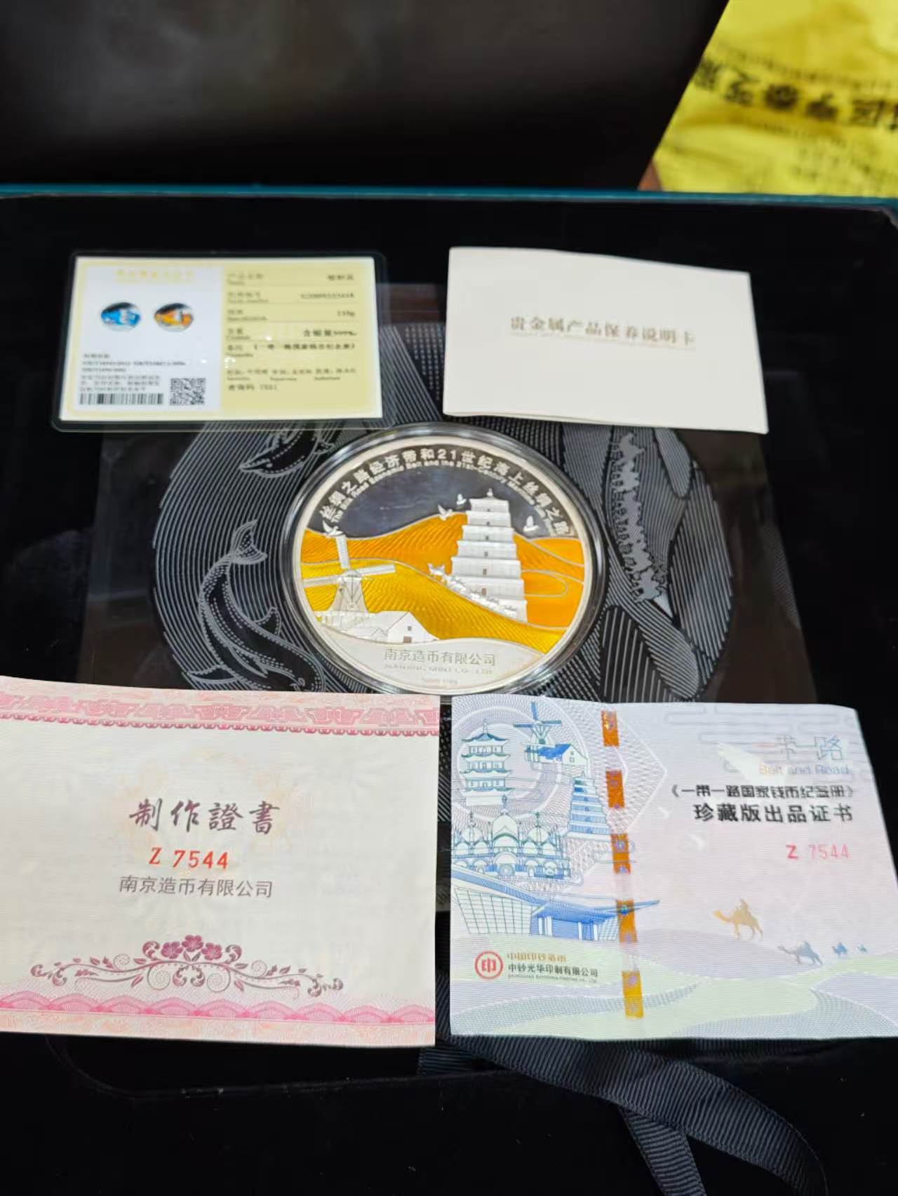 售一带一路海上丝绸之路999纯银章一枚,证书齐全,重210克,2019年买8000元,现售4800元。彩色精美无限,包邮,24小时后需电话联系,